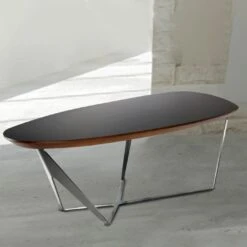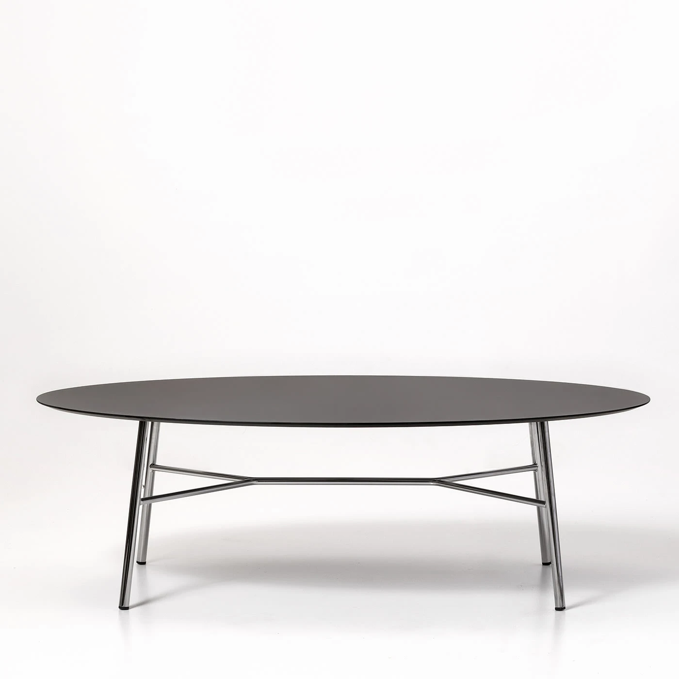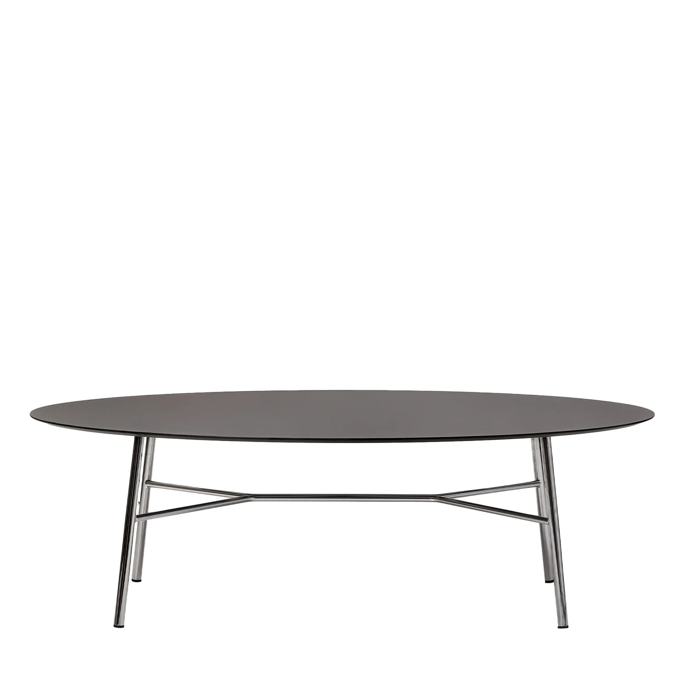 This oval coffee table allows for enjoying the simple pleasure of a tea or coffee break with effortless elegance. The black HPL top rests on a glaring chromed base comprised of tubular legs connect by means of a branched, matching element. Please refer to the Concierge for inquiries on available finishing options and top variants.