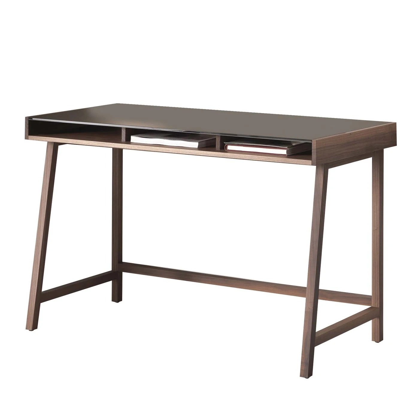 Prized materials and clean aesthetic effortlessly merge in this exquisite writing desk by Fabio Rebosio. The structure is crafted of Canaletto walnut wood and enriched with a matte bronze-lacquered tempered glass top, while the shelf features a walnut wood veneer (also ash wood). This refined object comes in several finishes for both wood and glass, please contact the Concierge for options and pricing.