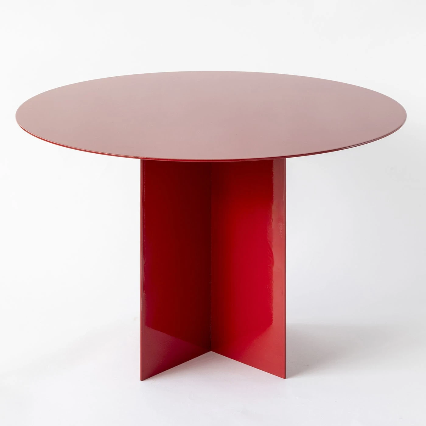 An iron origami that seems light, a game of cross-shaped forms and surfaces of any geometric shape define this collection of tables, characterized by a common color. The cross-shaped base fits any shape of the top, all produced with a 3mm metal plate of customizable color, a project in the making, a construction game in which the end user is free to create their custom table, a project within a project. Please, ask the Concierge Service for any dimensions and colors customization.