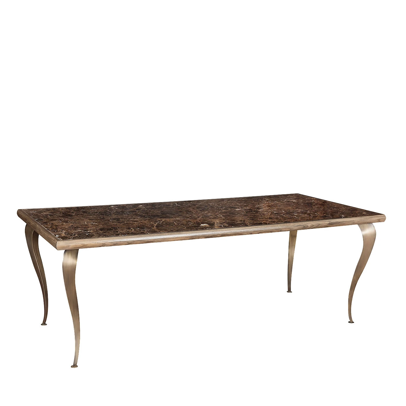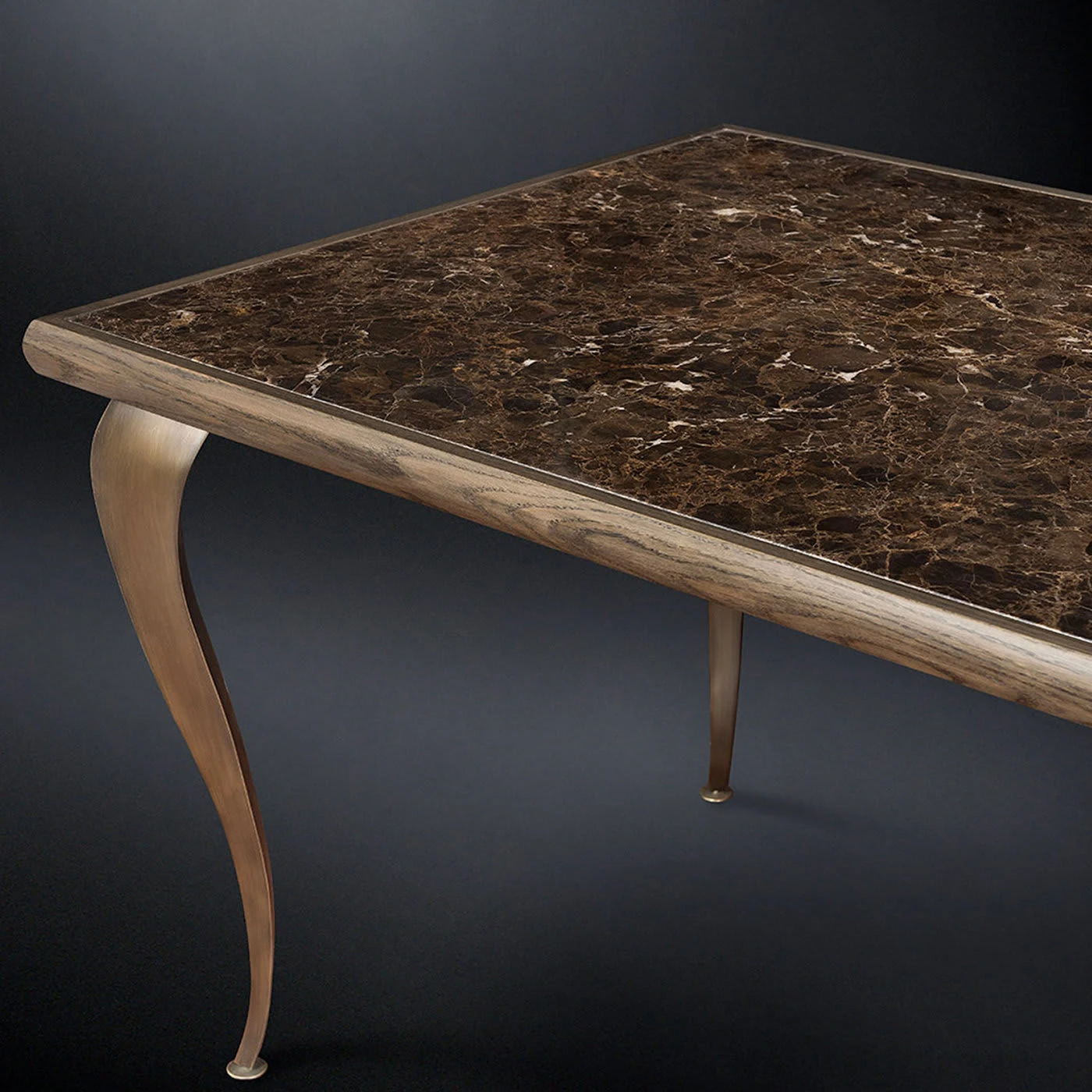 This elegant dining table will bring a touch of luxurious sophistication to a classically decorated dining room, thanks to its exquisite craftsmanship and the use of precious materials: the solid oak wood structure into which a top in dark Emperador marble is built. The striking natural veins of the marble are a one-of-a-kind natural decoration of the piece and complement the brass finish on the curved metal legs, which are equipped with adjustable feet.