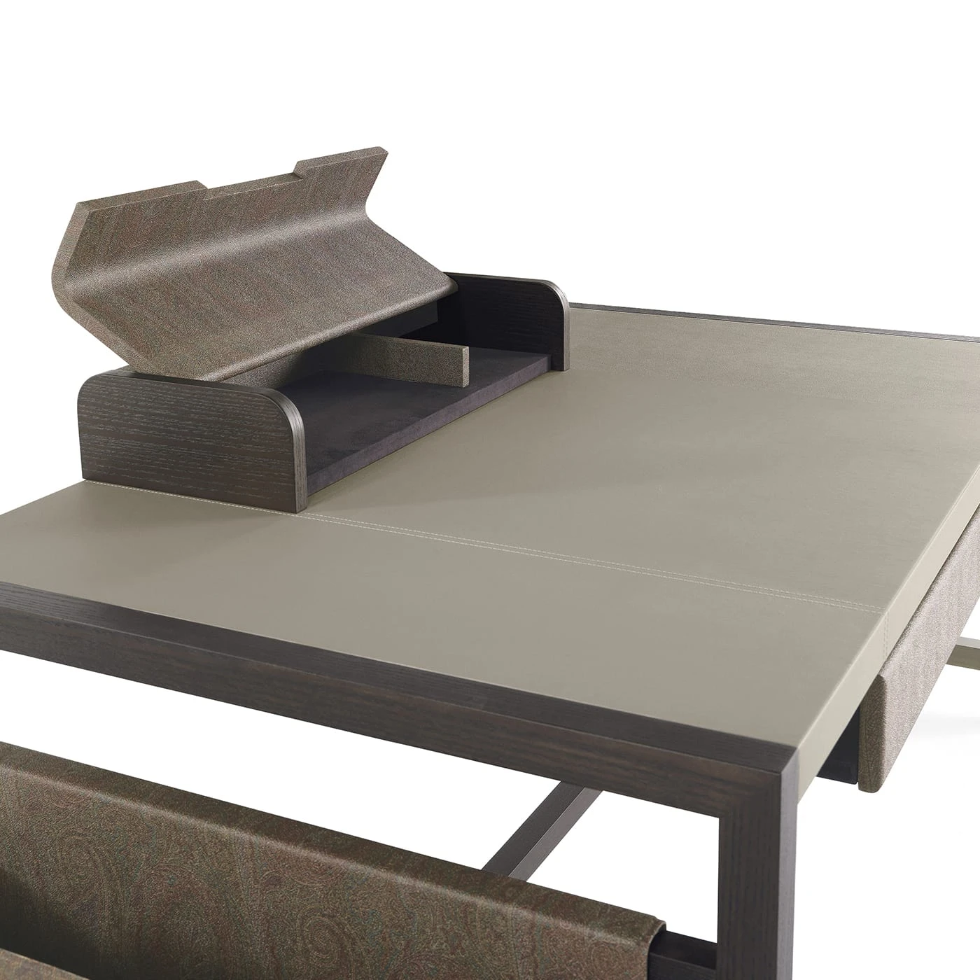 Institutional tones and rigorous lines for the first desk of ETRO Home Interiors. The protagonist of the office area, Akbar is enriched by the presence of archetypical elements such as the iconic fabric with a paisley design, representative of ETRO leather goods, which upholsters drawers and storage compartments. Akbar Desk with structure in solid oak wood finished with matt dark wengé dye with feet and side rails in brushed dark bronze aluminum. Desktop in multilayer wood covered with leather.