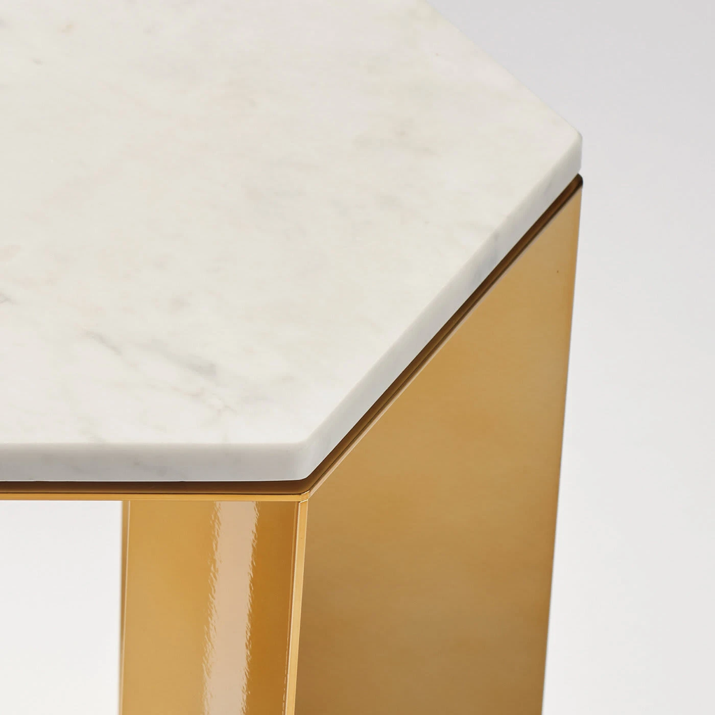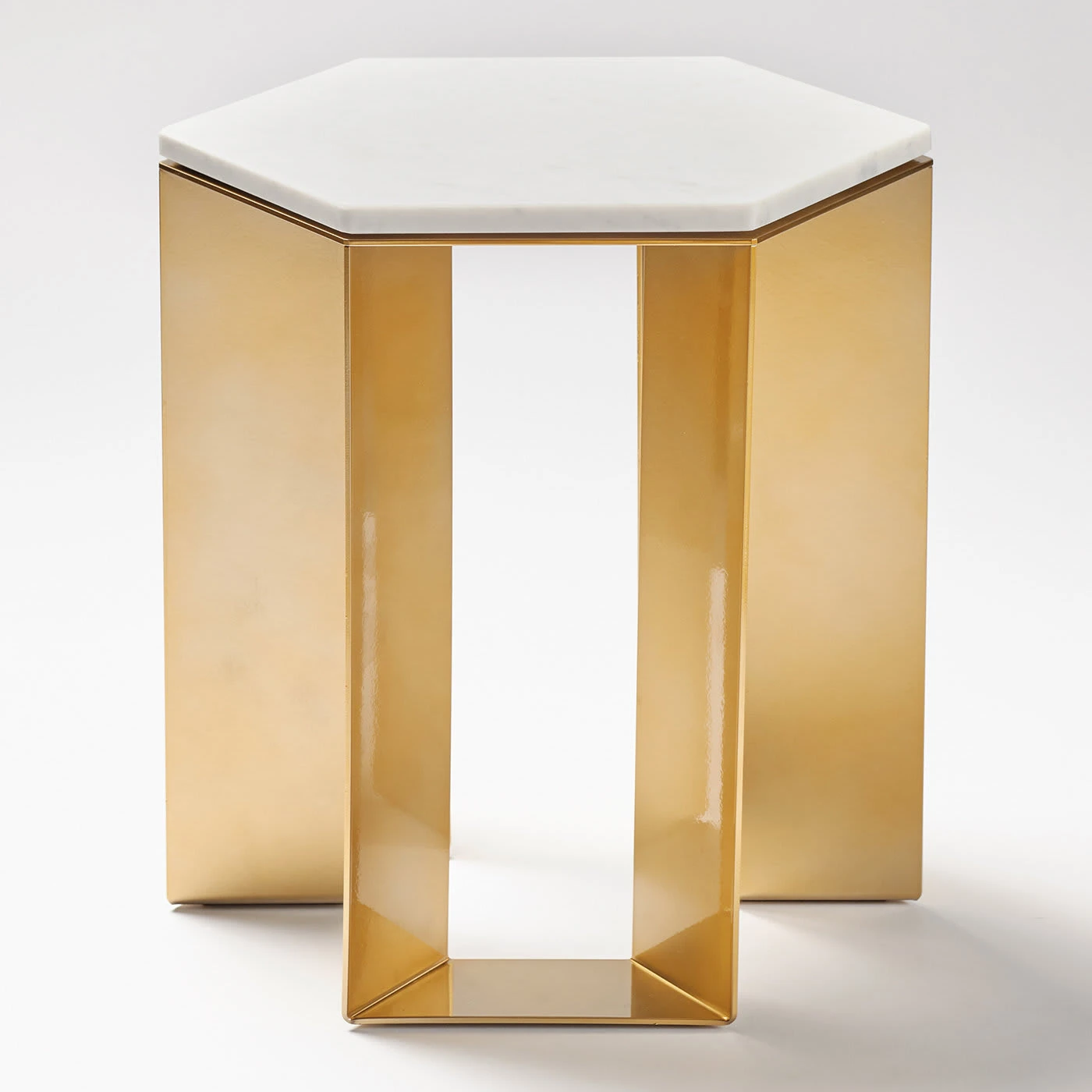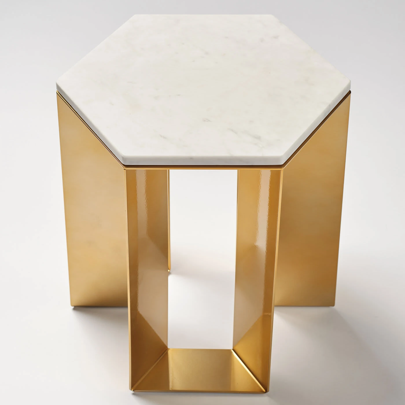 A clean and balanced design by artist Antonio Saporito, this side table belongs to a refined series created by artist Antonio Saporito for contemporary interiors. Elegant and refined, it rests on a gold-lacquered metal base featuring lightweight and sleek legs, supporting an hexagonal-shaped top exquisitely fashioned of white marble. Please consult the Concierge for further details.