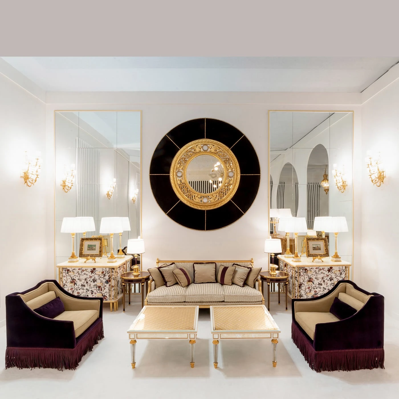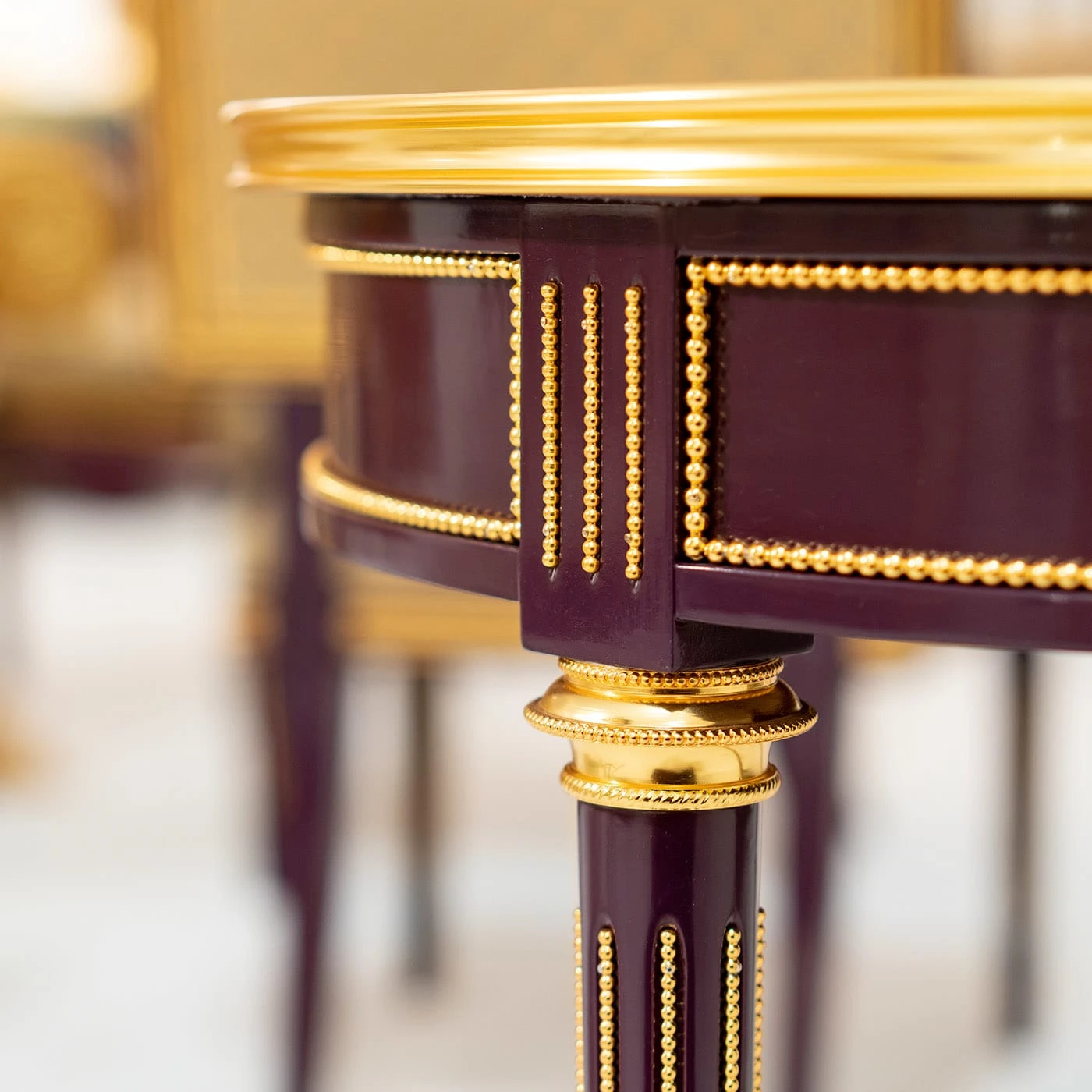 An extraordinary embodiment of a timeless and lavish style, this stupendous side table will make for a singular accent piece to a classic interior decor. Handcrafted of wood. it is lacquered in an elegant purple shade enriched with gold leaf decorations and 24K gold-plated bronze details. Please consult the concierge for further information.