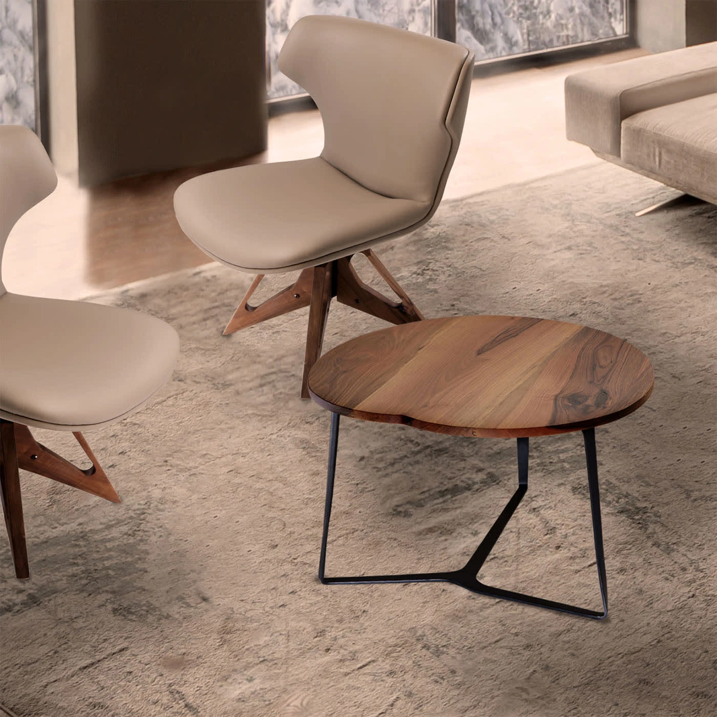 Dynamically bent and converging at the base, thin profiles trace the graceful steel structure of this refined coffee table. The sturdy blonde walnut top, marked by an apple-like shape, adds an ironic accent while seducing with singular veins and hues. The clever combination of contrasting materials and fluid lines underlines its spirit halfway between art and craftsmanship.