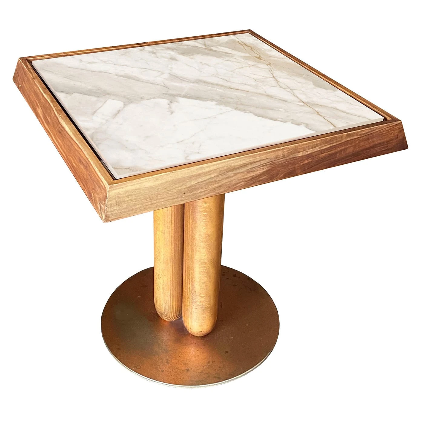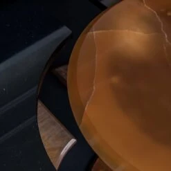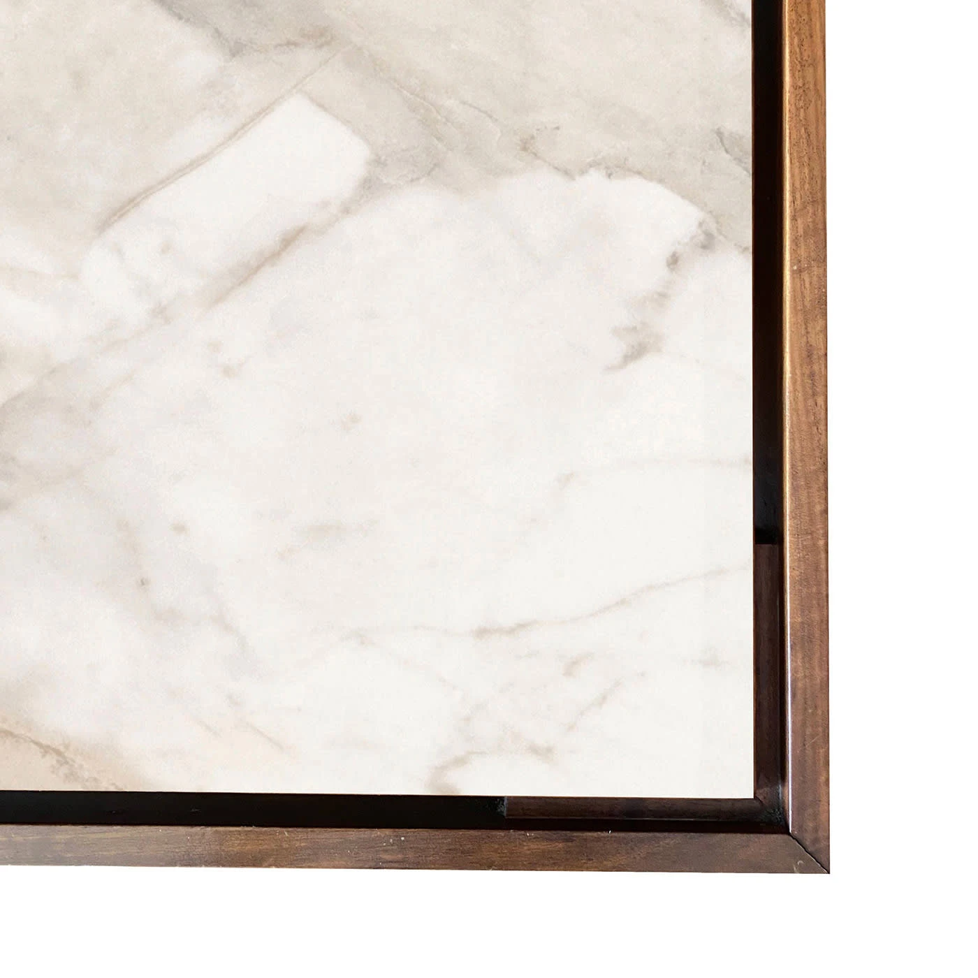 A precious Calacatta Oro marble top – with its warm, intricate traceries against a beige backdrop – completes this superb coffee table, designed in 2014 by Ferdinando Meccani. Part of a 2022 limited edition counting only ten numbered pieces, it is crafted of solid walnut and comprised of a bold frame welcoming the marble top and three legs delicately resting on the copper disk.