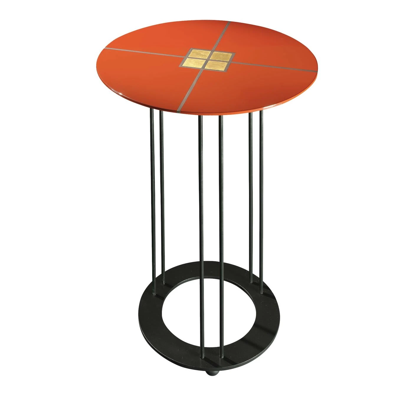 Sleek proportions and modern aesthetic qualities define this side table from the Aureola Collection. The tall profile features a round wood top finished with a red polyurethane lacquer that is supported by three open-frame legs fixed to a circular base and three orb-like feet, all in matte black powder. A delicate cross inlay adds striking visual dimensionality, the linear ebony details radiating towards the central square with gold leaf decoration.