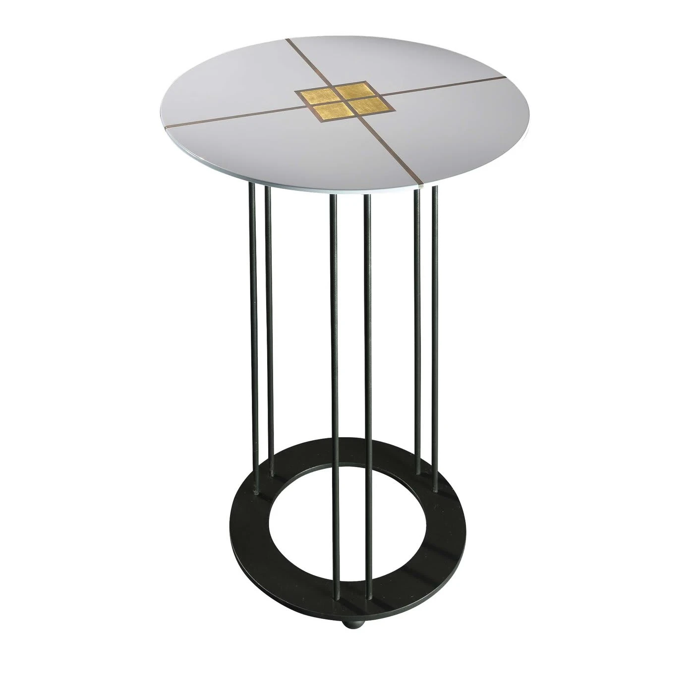 This tall side table will be a stunning complement to a modern interior. The dainty round top is made of wood with a celadon polyurethane lacquer and supported by three column-like legs fixed to a circular base in matte black powder. A delicate cross inlay adds striking visual contrast, the linear walnut details radiating towards the central square in gold leaf for a stunning finishing detail. The base is propped up by three orb-like feet for ease of arrangement.