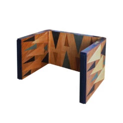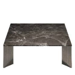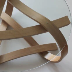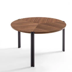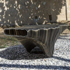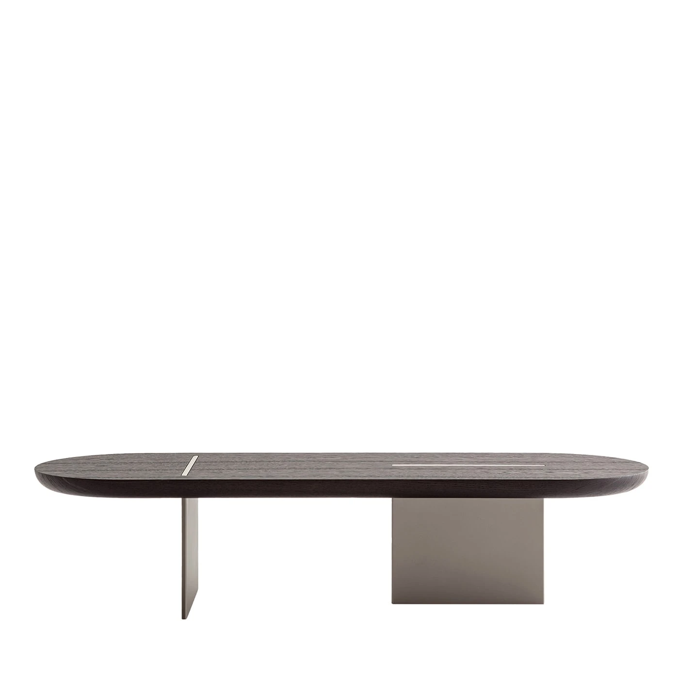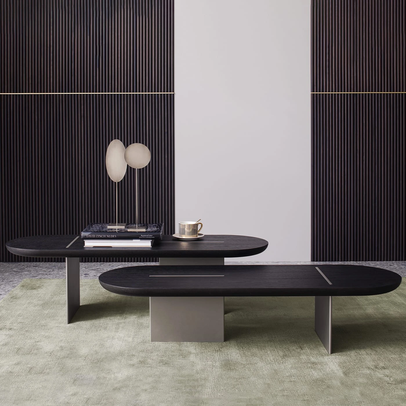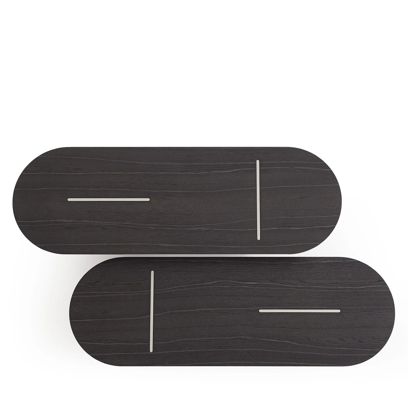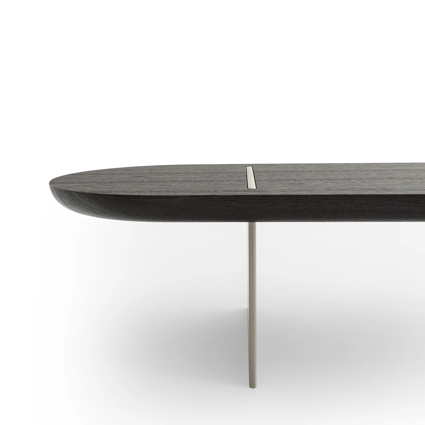 Poetically inspired by a typical French baguette in its elongated and rounded profile, this coffee table hints at reassuring everyday moments while never renouncing exclusivity. Orthogonal champagne-hued metal sheets varnished with epoxy powders create the airy and sculptural base, which sustains the blunted MDF top veneered with Laguna oak and finished low-environmental-impact varnishes.