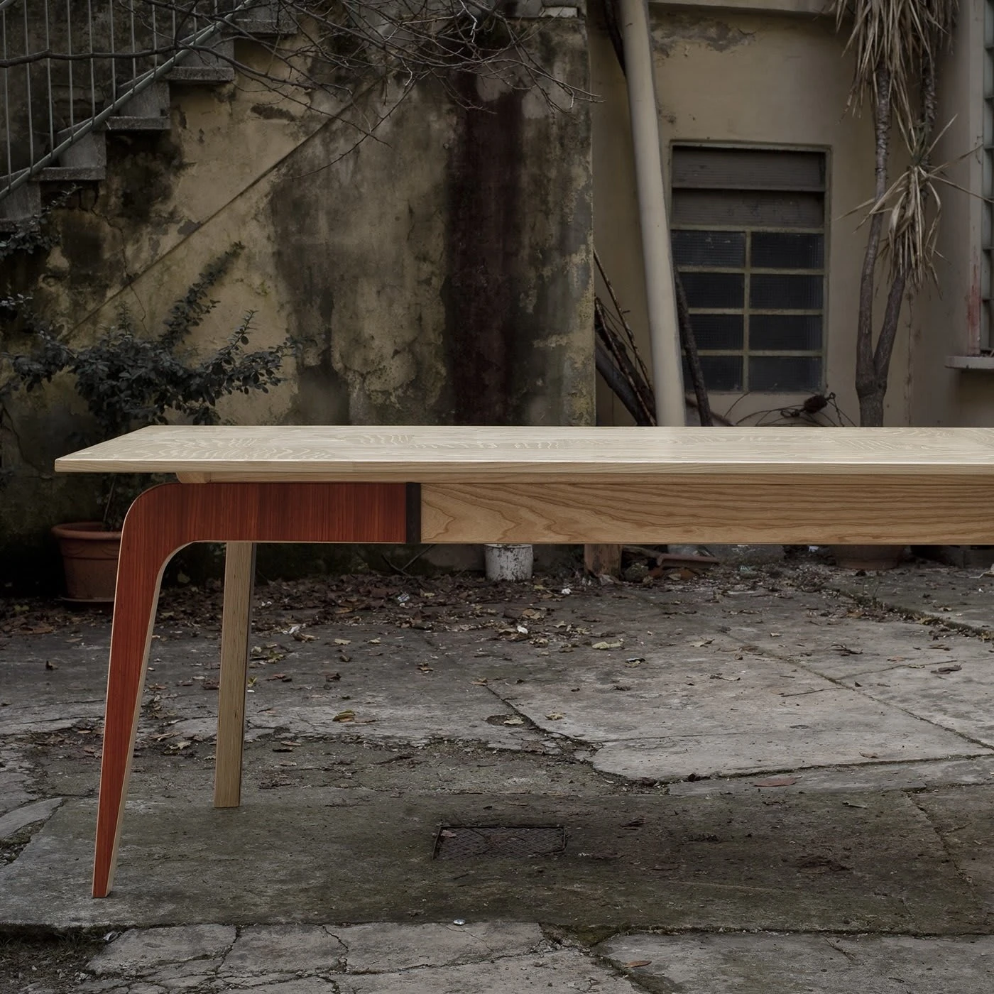 This striking dining table will make a statement in any contemporary decor, thanks to its simple silhouette and the use of different woods whose hues and natural veins add accents of different colors and textures to the piece: from the honeyed shade of the ash wood, to the dark brown of the wenge, to the orange-red of the padauk. On the top, a series of inlays in ash wood feature their natural veins and are framed by white lines that separate each inlay.