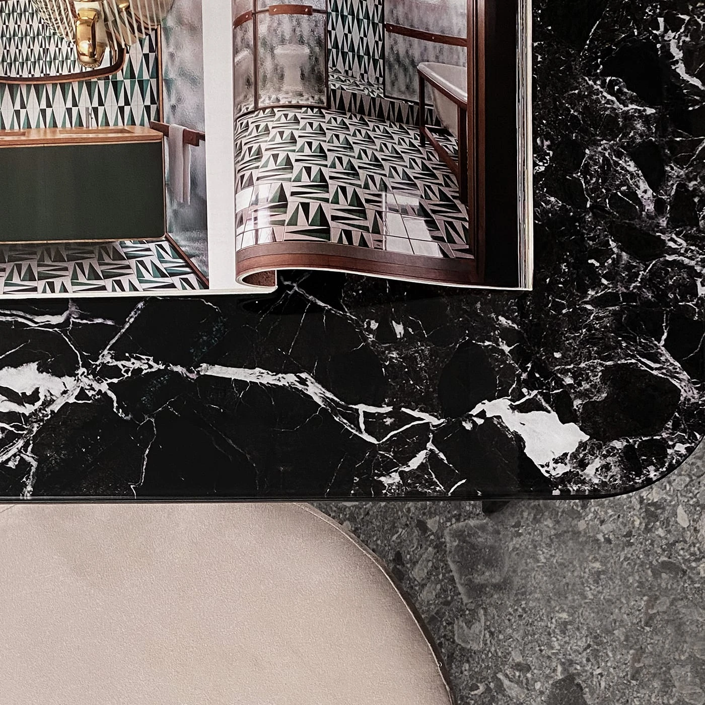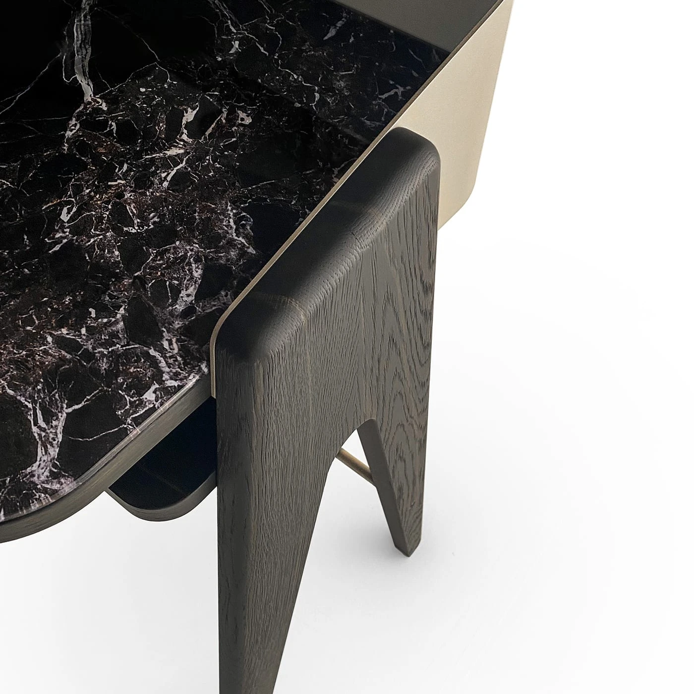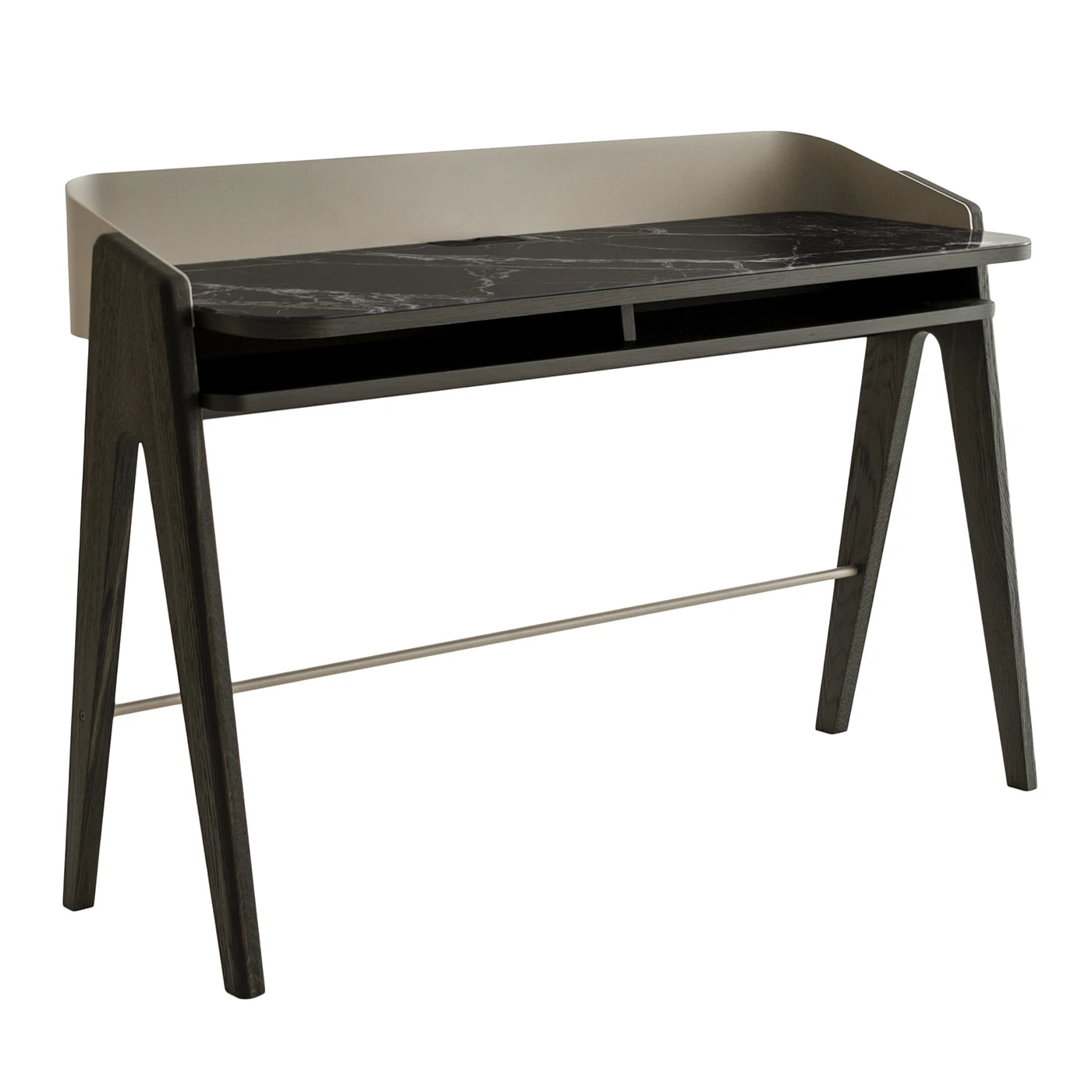 Brimming with exclusivity, this writing/vanity desk is an exercise in superb finishes also borrowed from nature. Distinguishing detail is the Breccia Imperiale marble effect the back-printed glass top flaunts, its shades harmonizing with the enveloping champagne rolled metal frame and solid Laguna oak the V-shaped legs are crafted of. The same timber veneer is used on the MDF top.