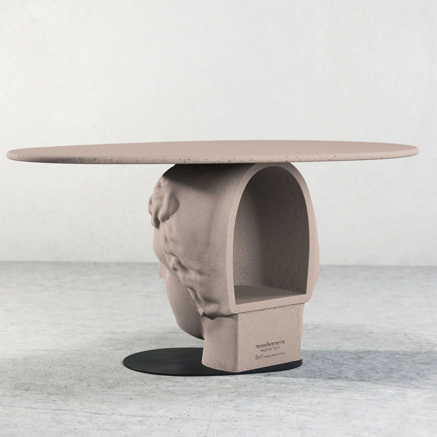Enhanced with a delicate powder-pink hue, this stunning coffee table is marked by soft and delicate lines elegantly contrasting the hard edge of concrete. Embodying the phrase “Concrete is a stone that is born, and natural stone is a stone that died”, this piece features a classic-inspired female bust supporting a thin oval top. This coffee table belongs to a splendid series designed by Marialaura Rossiello Irvine.