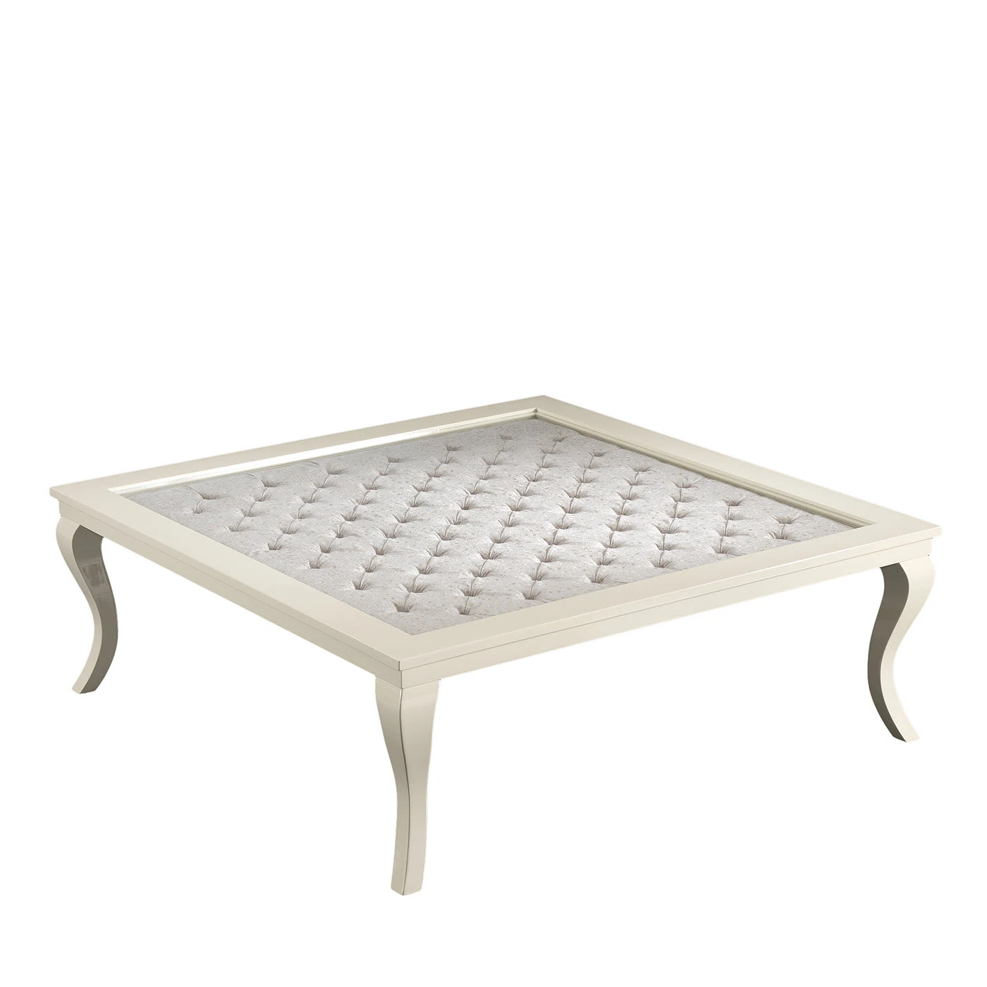Modern details and classic inspiration merge in this splendid coffee table infused with classic elegance. Lacquered in off-white to make it ethereal and luminous, its solid wooden frame comprises graceful, cabriole-style legs supporting a square tabletop revealing a mesmerizing tufted design of exquisite sartorial flair. This superb coffee table will effortlessly take center stage in any living space.