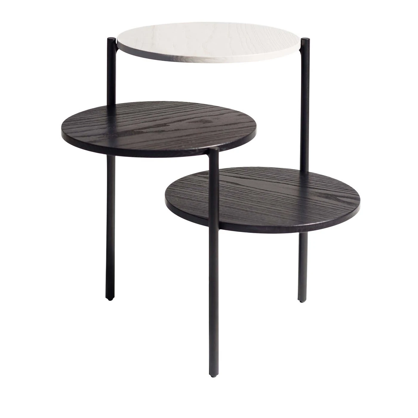 With a stylish and practical design, the Triplo triple table makes an elegant and functional addition to your favorite living space. The three colored table tops are crafted from soild wood and are supported on a black metal frame. The top of the highest coffee table is in light gray color. A compact way to provide more table area for your entertaining requirements, this popular accessory is also available in other colors.