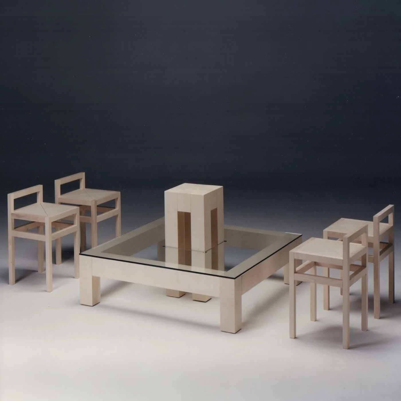 Constructed of a maple frame with a glass top, this striking piece showcases a smaller wooden table at its center seemingly penetrating the glass surface of the larger one. This table measures 110x110x26 cm (the height of the inside table is 29 cm) and comes with four coordinating square stools (35x35x50 cm) to give a modern update to any interior with its overall minimal design, defined by an eye-catching contrast of materials and shapes. Customization available in other woods and with a lacquered finish. Contact the Concierge for details and pricing in the various options. Designed in 1992.