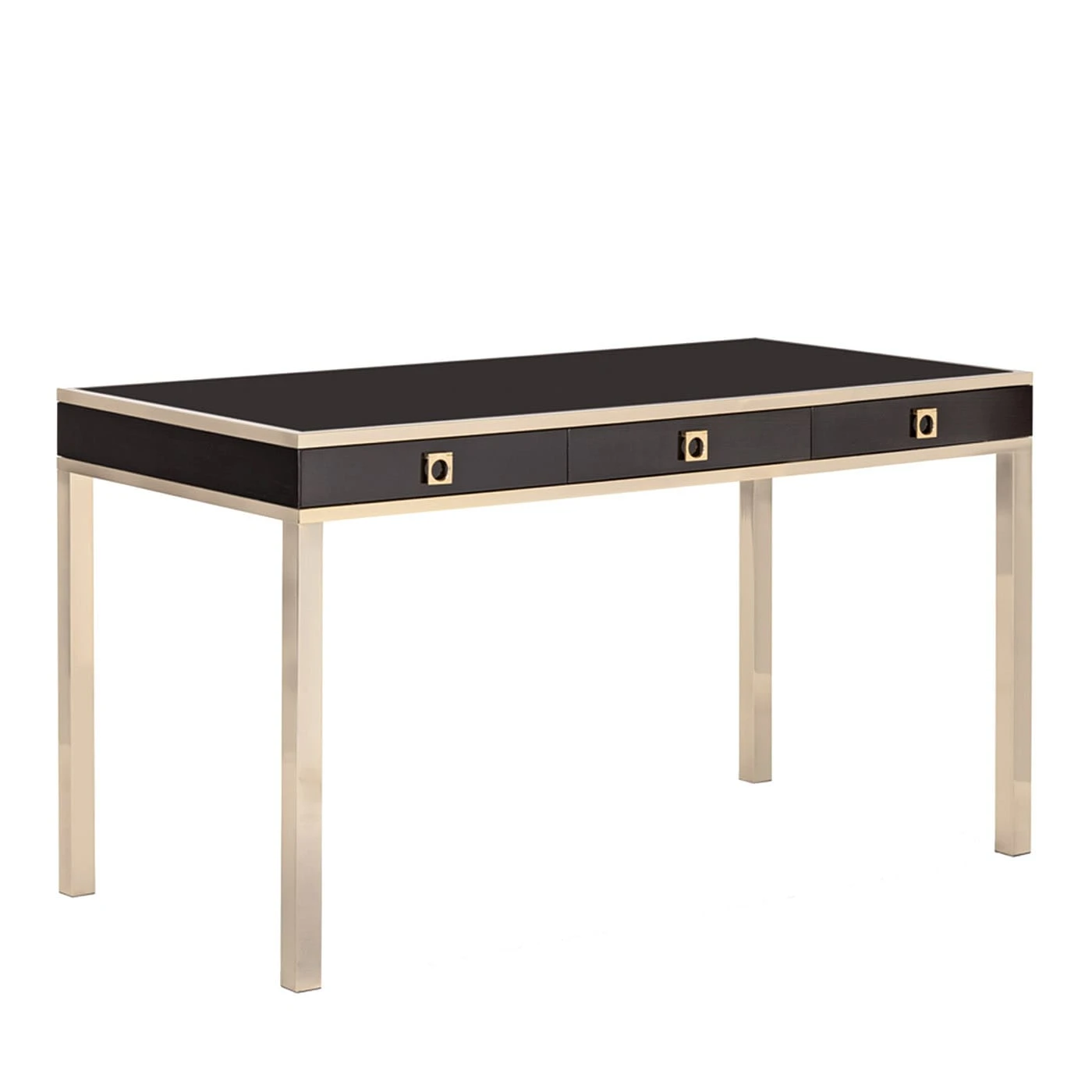 Writing desk with Art Déco inspiration. The rigorous lines of Camilla mix glossy natural brass legs with black maple top to achieve a look marked by timeless elegance. It is available in different finishes. Please contact the Concierge for other information.