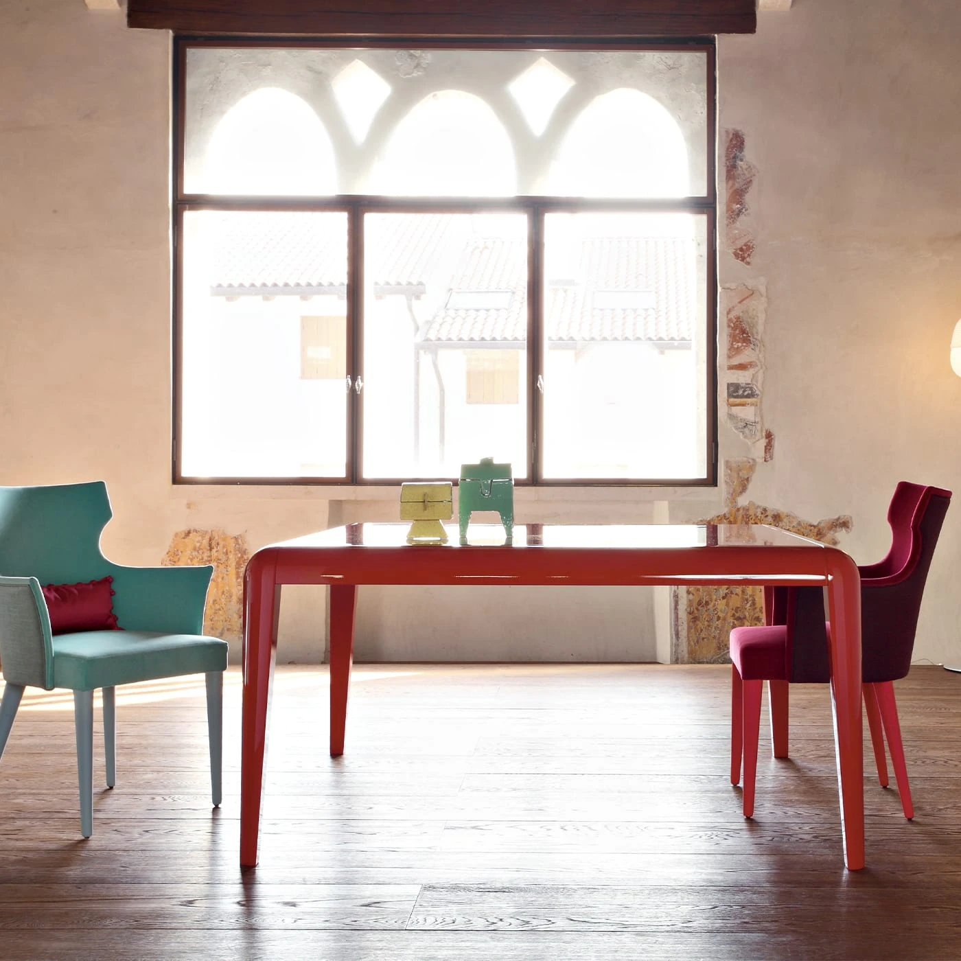 The Capri table shows off its own lines through colors with a strong visual impact, such as Cherry Red glossy finish. The glass lacquer reflects the surrounding environment almost as if wanting to impose its own presence. The straight lines of the rectangular base curve at the edges and effortlessly flow into the tapered capped legs, giving the appearance that the table was crafted out of a single piece of wood. Customization upon request.