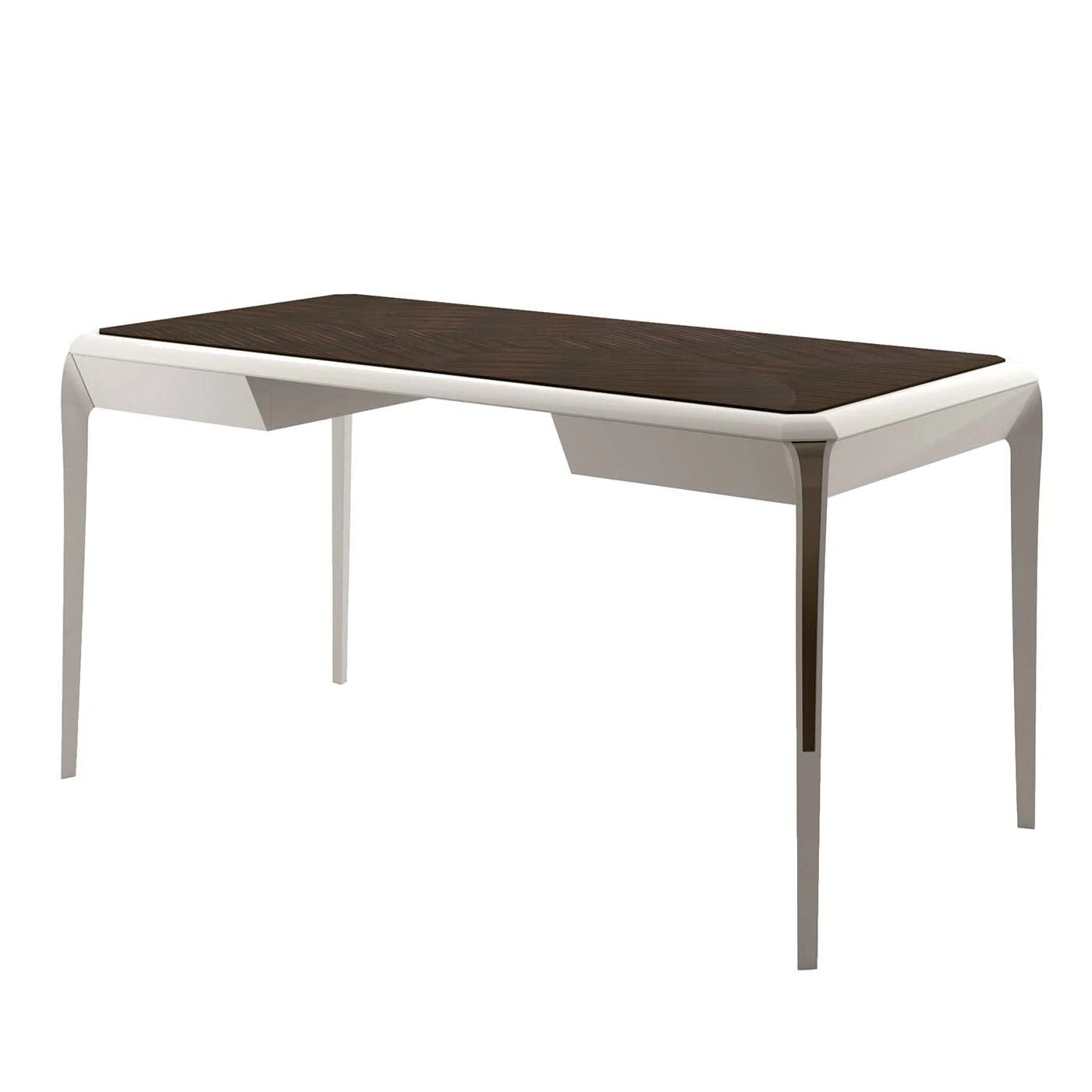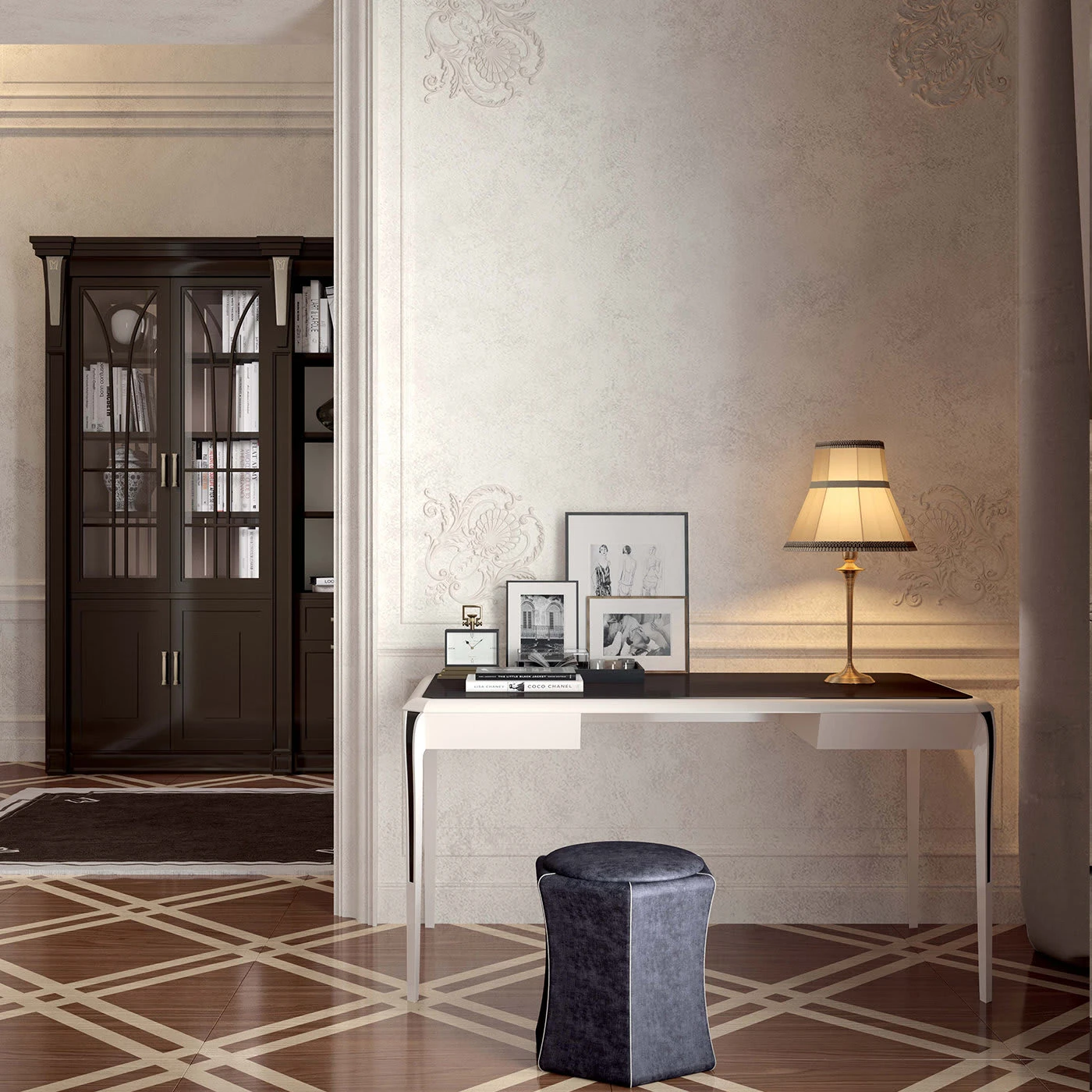 This stunning writing desk has an elegant and dynamic silhouette where geometric shapes blend harmoniously in a basic color combination. This minimal design is made of glossy white lacquered wood and features a rectangular top and slim legs accented with leather inserts and two underside drawers defined by dynamic slanted edges. The black leather is enriched with brown streaks that recall the pattern of natural wood. This exclusive piece can be used in traditional and contemporary interiors alike, where it will add a sense of aesthetic poise.