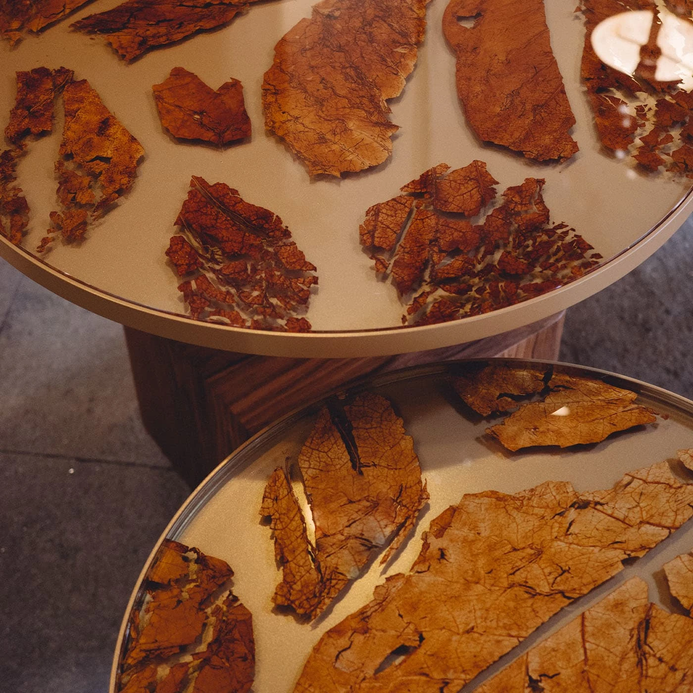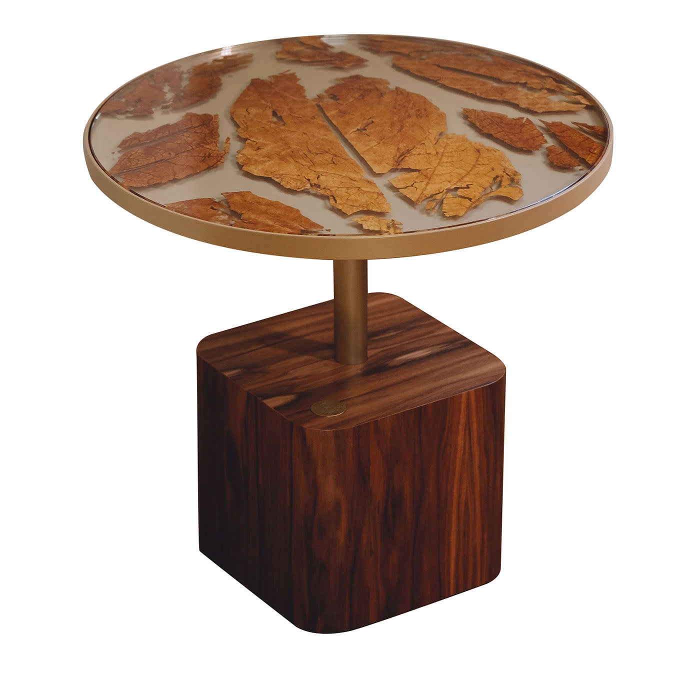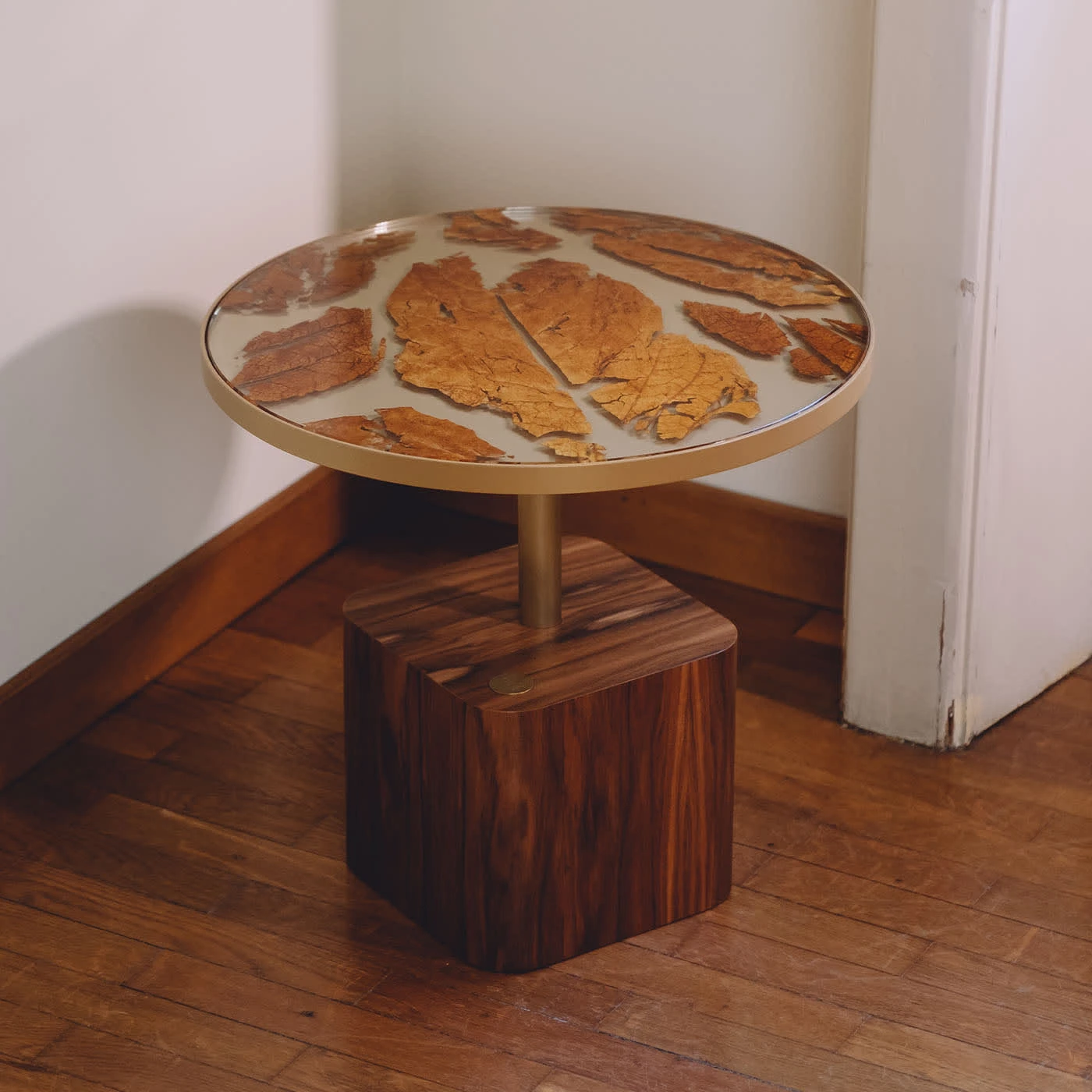 For cigar lovers and more, Margart has created a timeless coffee table. A new icon of luxury bio-design and a tribute to the ancient Italian tradition of growing tobacco leaves for the production of Tuscan cigars called ‘toscanelli’. The base is wood veneered in Palissandro, the table structure is satin brass, and the tabletop is composed of a glass top layered with tobacco leaves. The glass can be transparent or fumè color. Size: SMALL. Each coffee table is unique and can be customized.