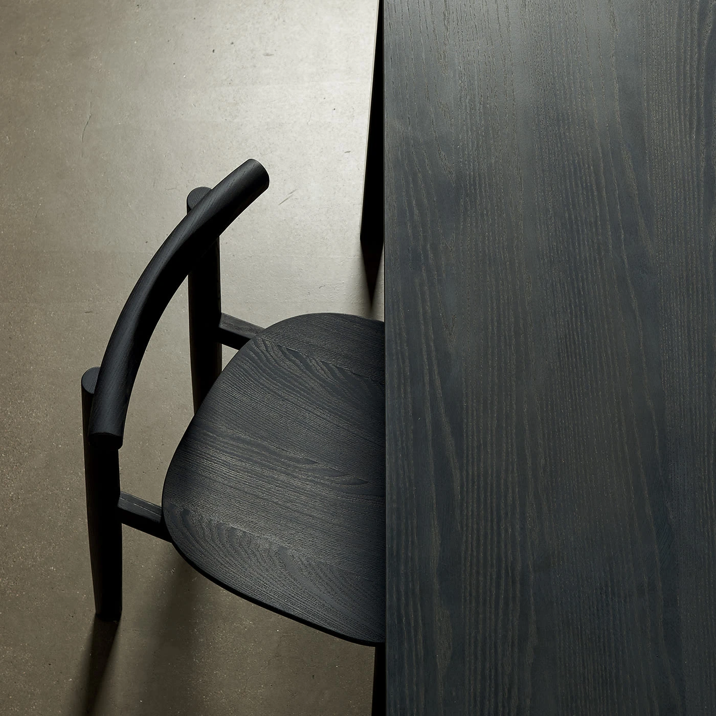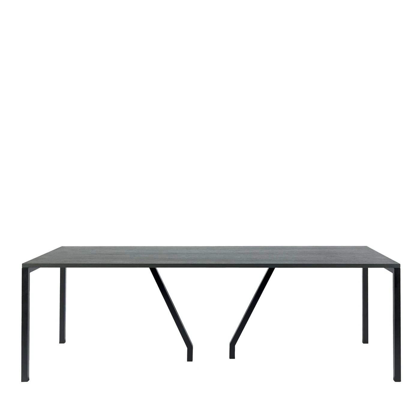 A thoughtful distribution of lines is behind the slight sculptural flair this table showcases. Designed by Studio Charlie, it is aptly named after the Italian for grasshopper, name that playfully explains the angled legs sustaining the rectangular black oak top in the center. The rest of the metal structure, finished in deep black, stays coherent to a rigorous minimalist inspiration.
