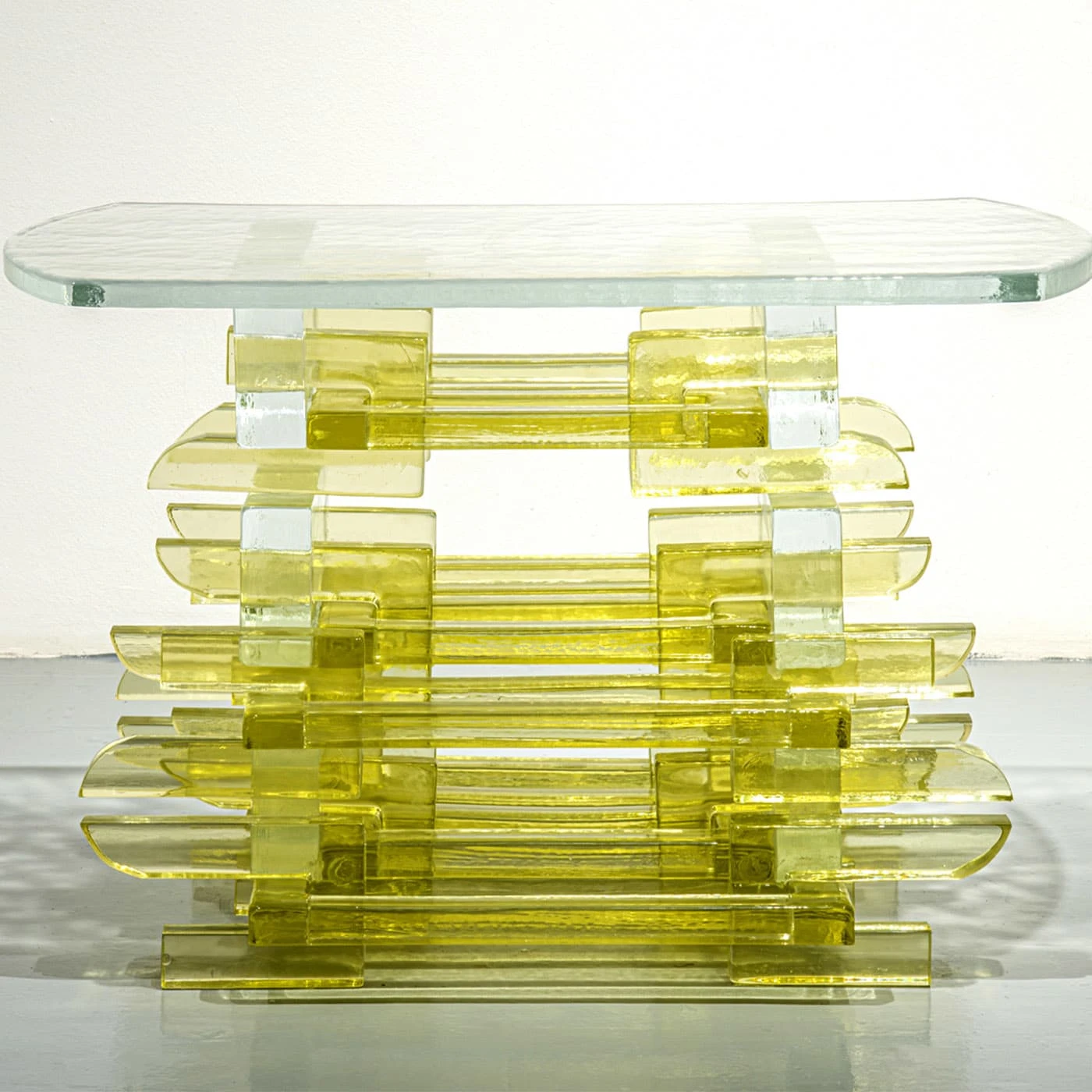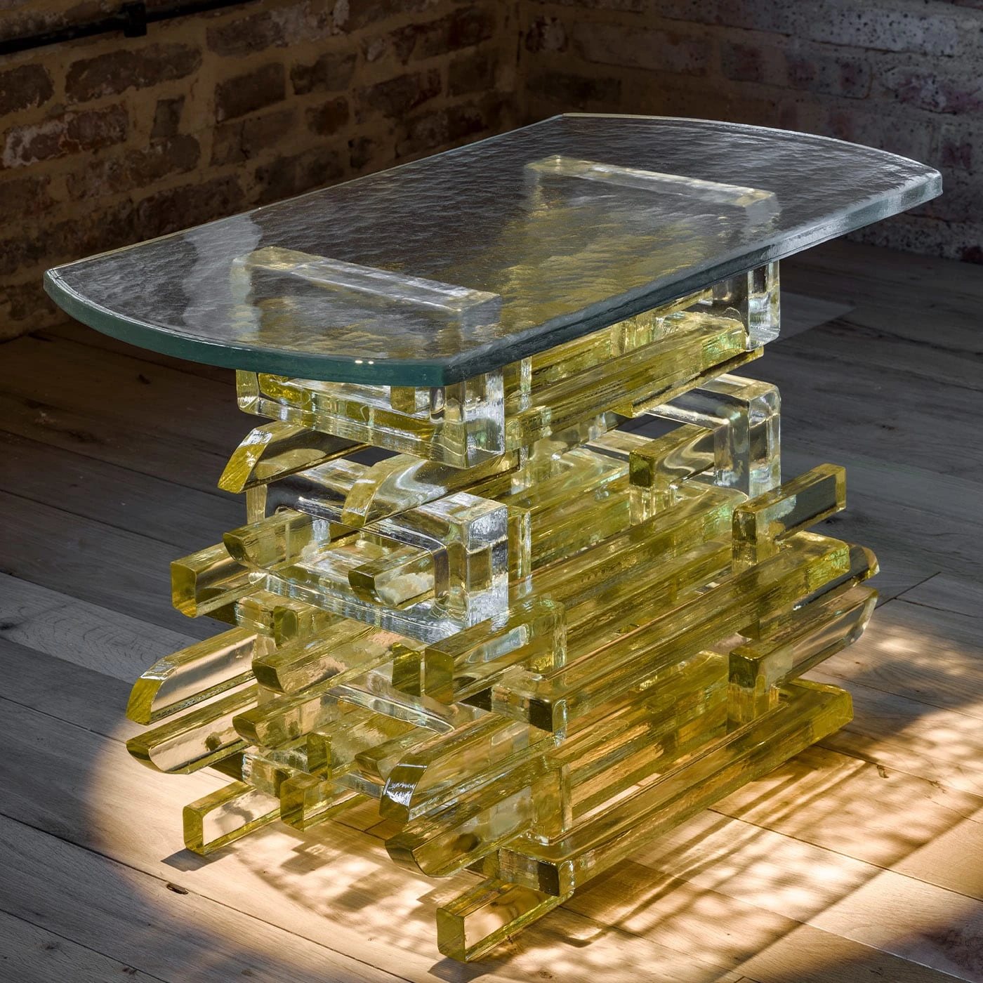 “Chain” is made using multiple donut bricks, cut into two parts and threaded through the centre of another. The curved and polished end details of the cut brick are a nod towards the painted ends found in many Japanese wooden temples. In this period of time when most travel is on pause Bethan took this opportunity to reflect on her adventures over the last two years in Asia, and use the interlocking glass components to reference the amazing joinery she photographed. Numbered Edition.