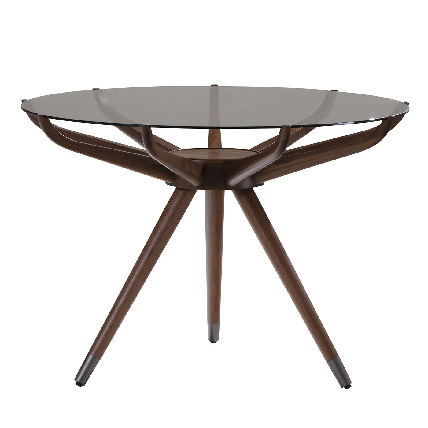 The dynamic and sleek design marking this round coffee table allows it to effortlessly complement any indoor setting. Its structure in solid, natural-finished walnut is comprised of a tripod base and nine-spoke upper support onto which rests the tempered glass top (0.5cm thick). Conveying visual lightness, the piece is finished with bronze-finished brass feet. It can be customized in a variety of finishing options upon request to the Concierge.