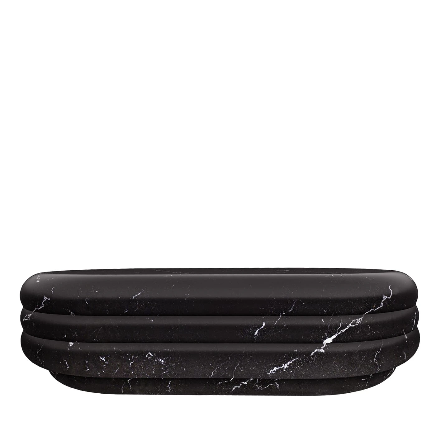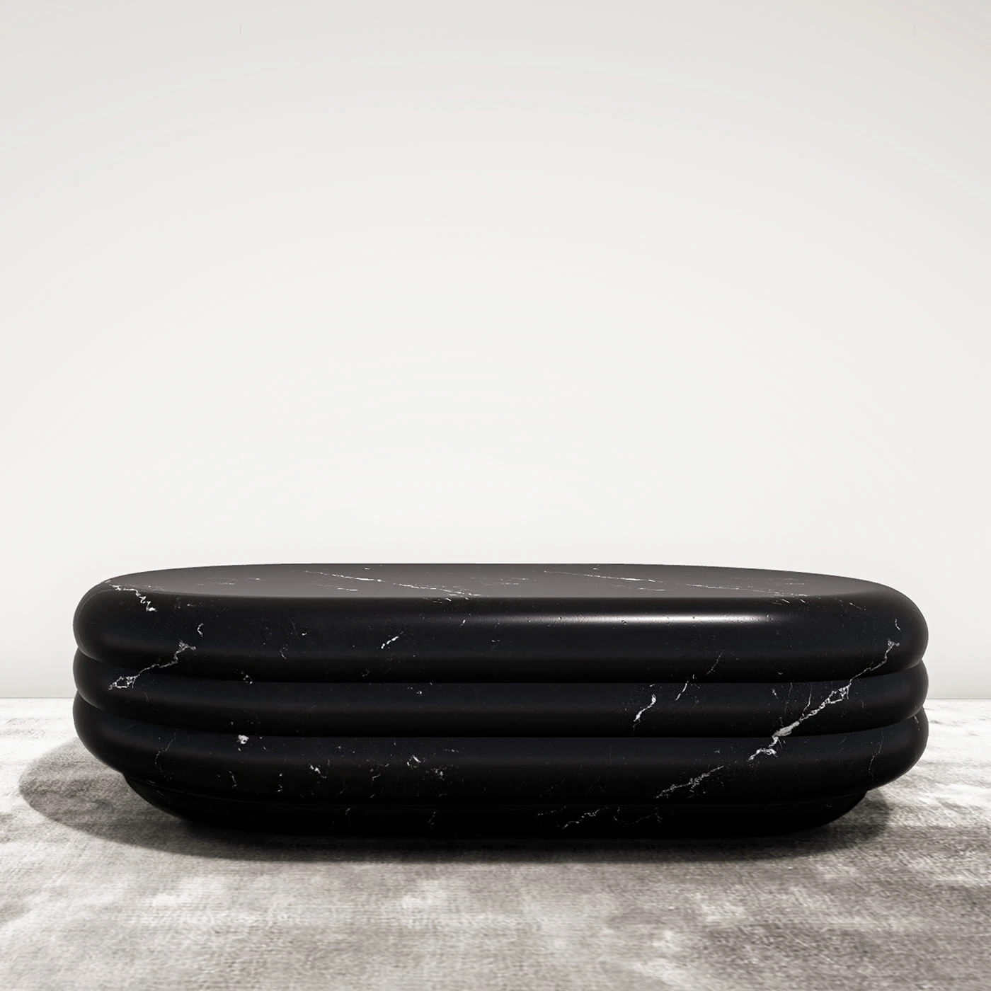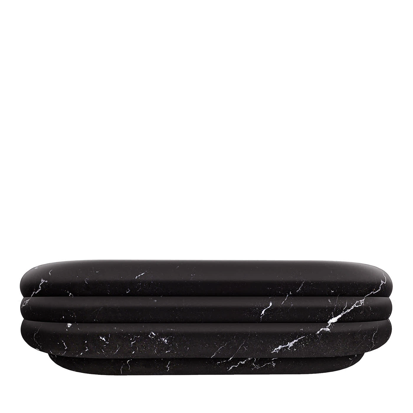 Modern-day coffee table inspired by bodily curves. Carved from a solid block of marble, the voluptuous silhouette and silky-honed surface of the oval shape invite you to touch and use it. Here in black Marquina, a Spanish calcite stone of such an intense black color that it resembles a dark night sky occasionally illuminated by the alternation of bright white veins and fossils.