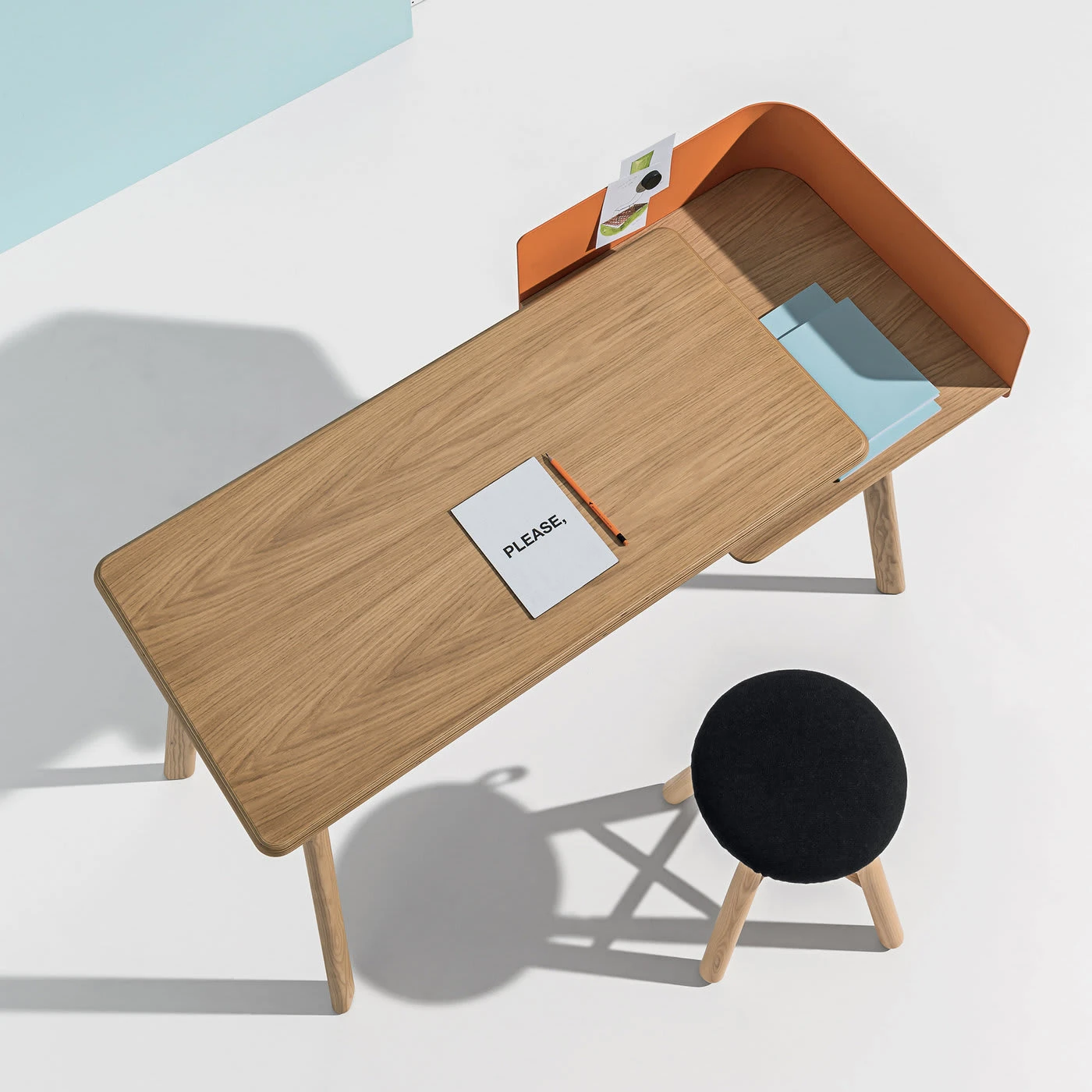 This striking writing desk consists of two elements, a large rectangular top and a small square shelf in multi-layer birch with natural oak veneer, which create a natural suspension effect. Resting on tall, slanted ash legs with natural finish, the shelf is accented with a curved metal panel in orange embossed metal that creates visual interest while offering privacy and a nook to store books and other electronics. Simple yet bold, this desk is compact enough to fit into a children’s room or a small personal office, bringing contemporary flair to any working space.