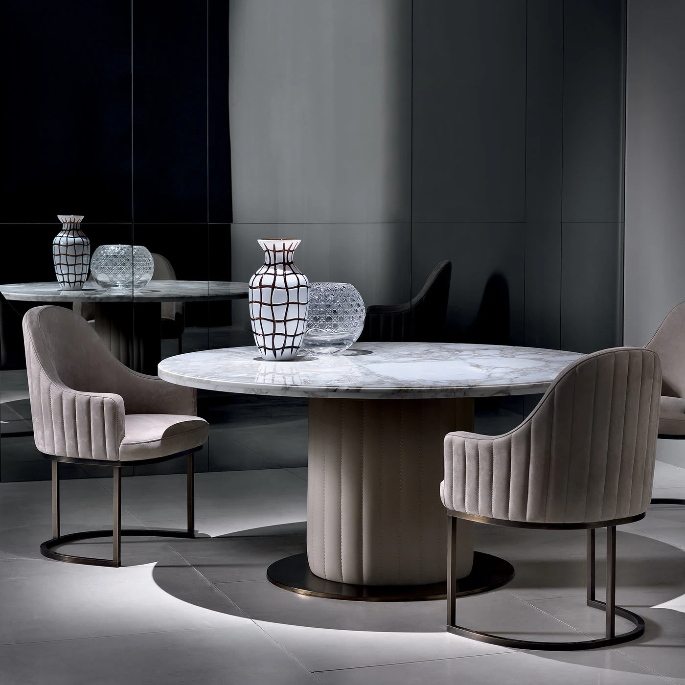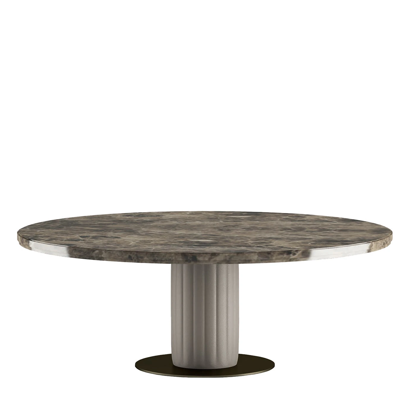 This sculptural table boasts two bold textures: the grosgrain design leather covering the pillar-shaped solid linden wood base and the Emperador marble top. The warm burnished brass round platform provides a luxurious detail reminiscent of the dark, rich browns and grays hues of the top creating a striking visual balance. A piece of refined elegance, this table can effortlessly go from the dining room to an office environment, as a stately conference table.