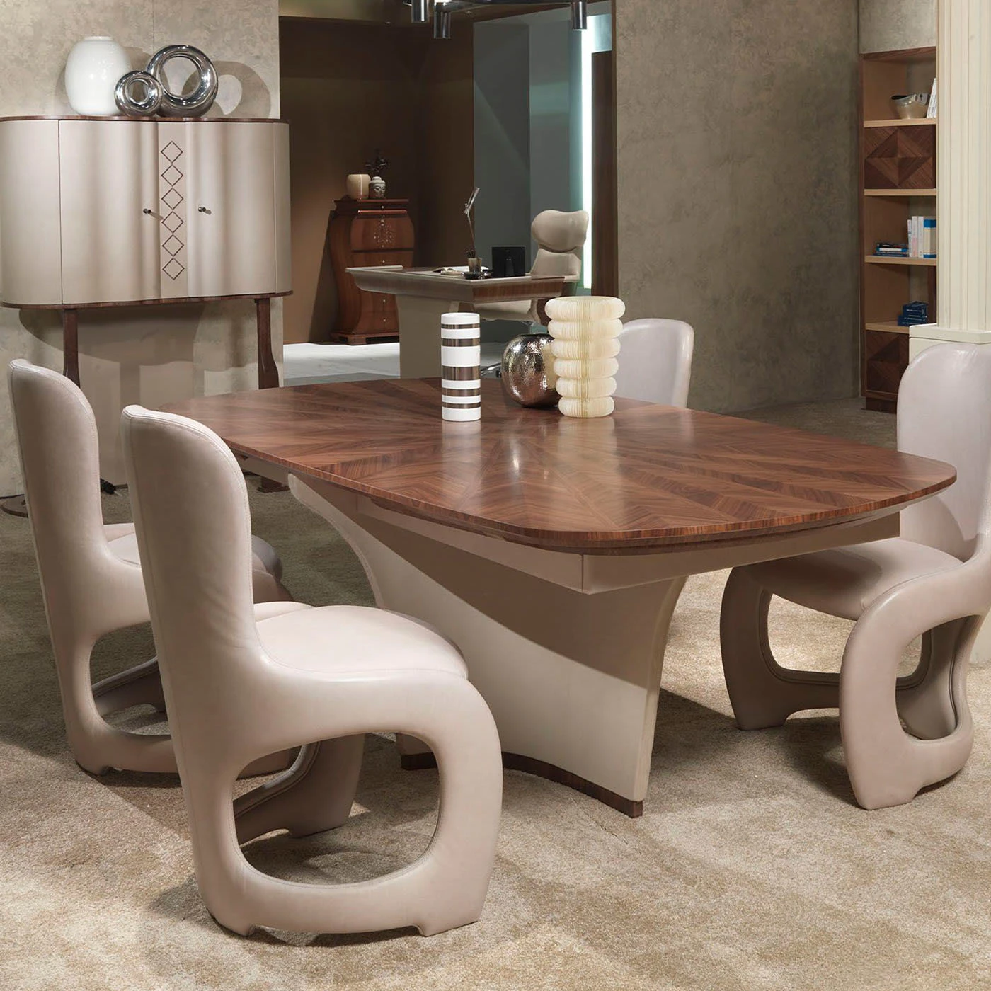 Luxe materials and dynamic lines merge in this sophisticated dining table that is sure to take center stage in any modern, neutral-toned dining area. The base is covered in prized leather for an opulent finish that complements the sturdy tabletop in Canaletto walnut adorned with inlays arranged to create a striking, radial pattern.Ā Its expandable design accommodates all types of dining occasions: itĀ measures 210cm when closed and 310cm when expanded.