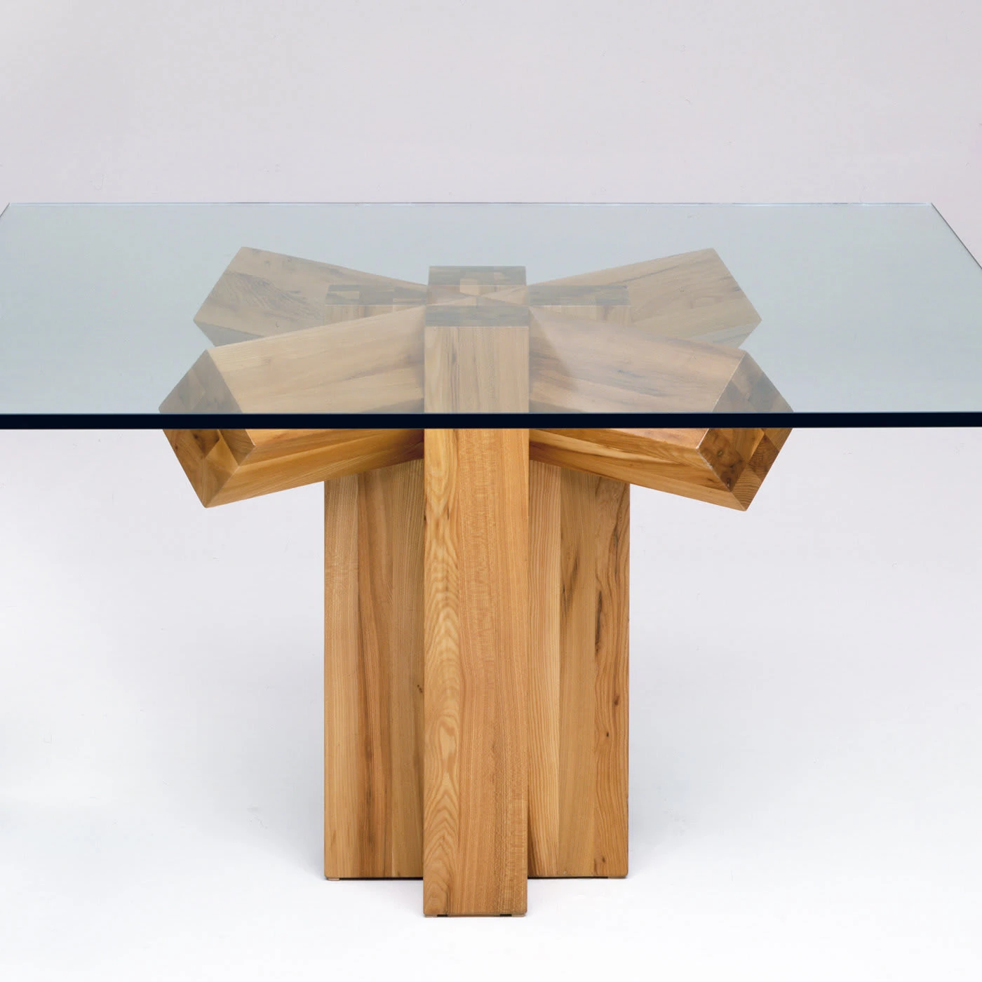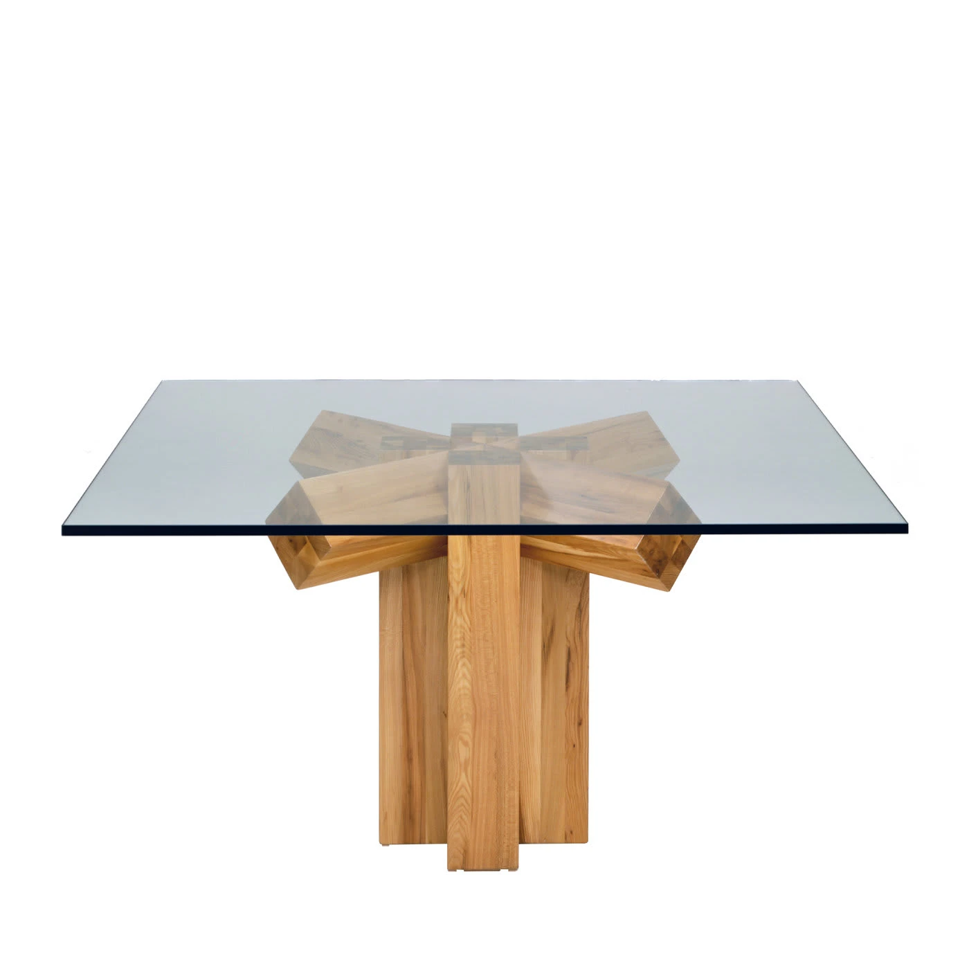 Boasting a striking and unconventional silhouette, this precious dining table is an object of functional decor that will not go unnoticed. The square top in extra-clear tempered glass (1.9 cm thick) reveals the sculptural and imposing base in solid walnut with a satin finish that emphasizes the natural veining. Best showcased in a modern or rustic dining room interior.