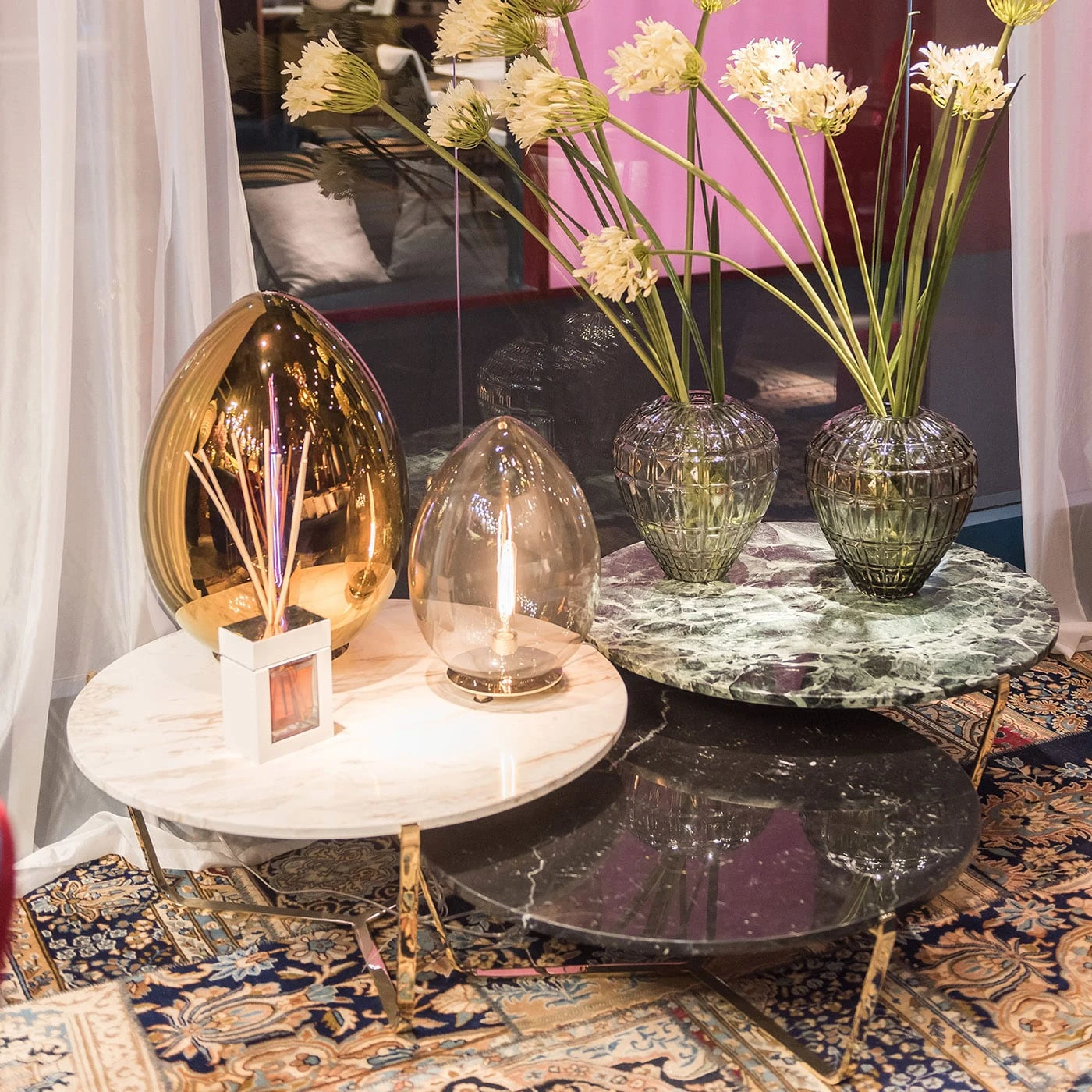 This stunning tall coffee table is part of the Dolomiti collection. Its steel structure is elegantly coated in 24k gold and comprises three slanted legs that cross at the base and stem upwards to support a superb round top in White Calacatta marble. The golden tones of the one-of-a-kind veins adorning the white background of the stone strikingly complement the warm glow of the precious metal for a sophisticated final effect that will add a lavish touch to any living room. This piece can be combined with its low version for a dynamic effect.
