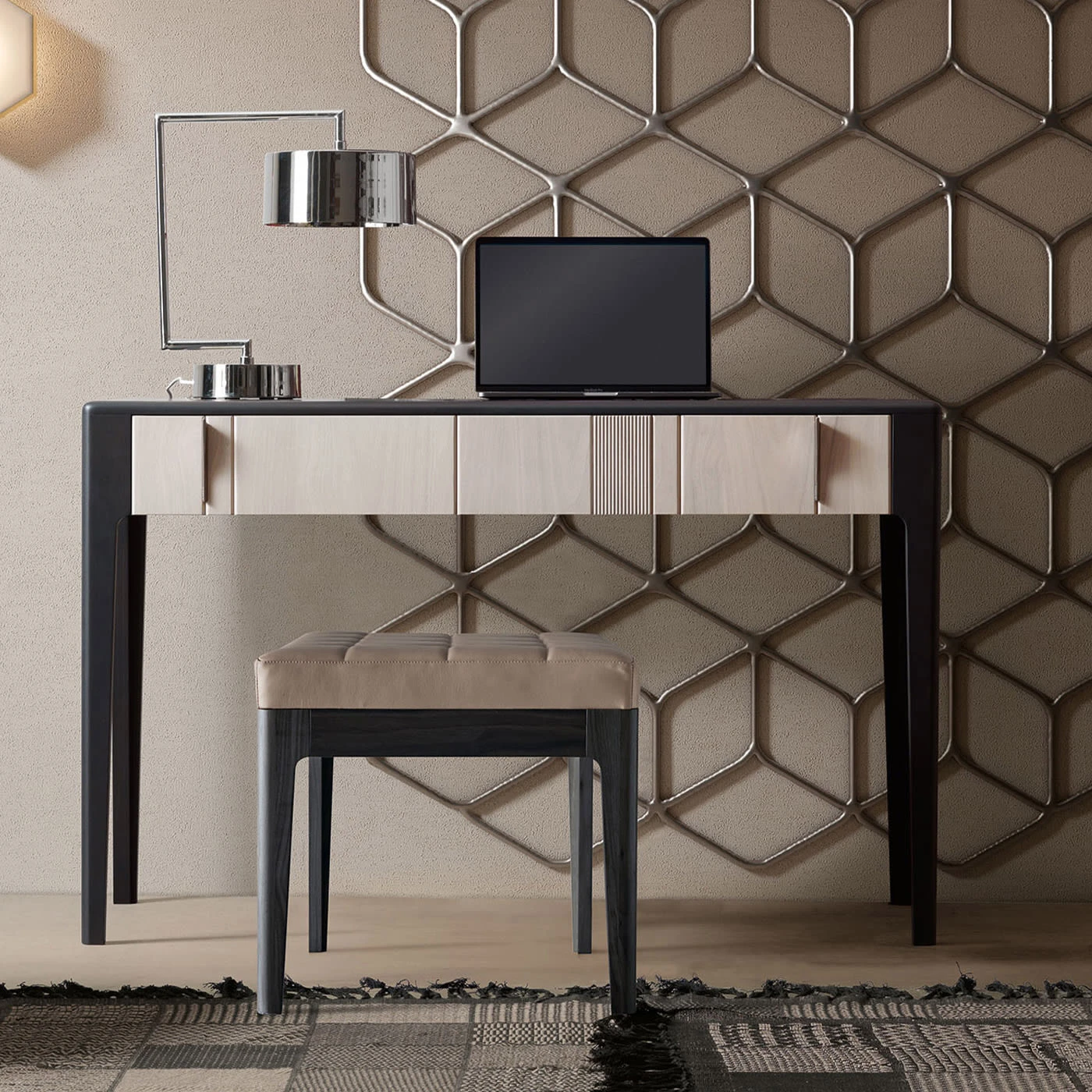 Wall writing desk with 1 drawer, ribbed slat. Anthracite and plaster finish. Gunmetal handles.
