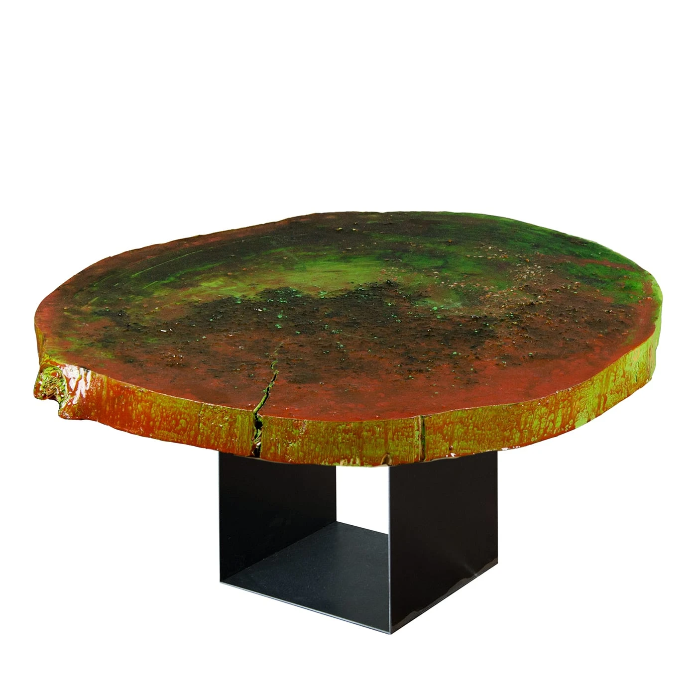 A singular design from the Domus Collection of numbered pieces, the Atrium Coffee Table features a striking, imposing top made from a trunk section of a solid cedar wood whose natural veins and imperfections are enhanced with resin and acrylic colors, painted by hand on the sculptural surface. It rests on a sleek iron base. All products offered are handcrafted one at a time. The raw materials used in the manufacturing process differ every time, consequently, there may be natural variations that are not to be considered product flaws.
