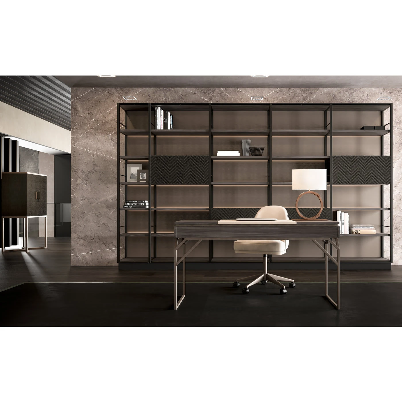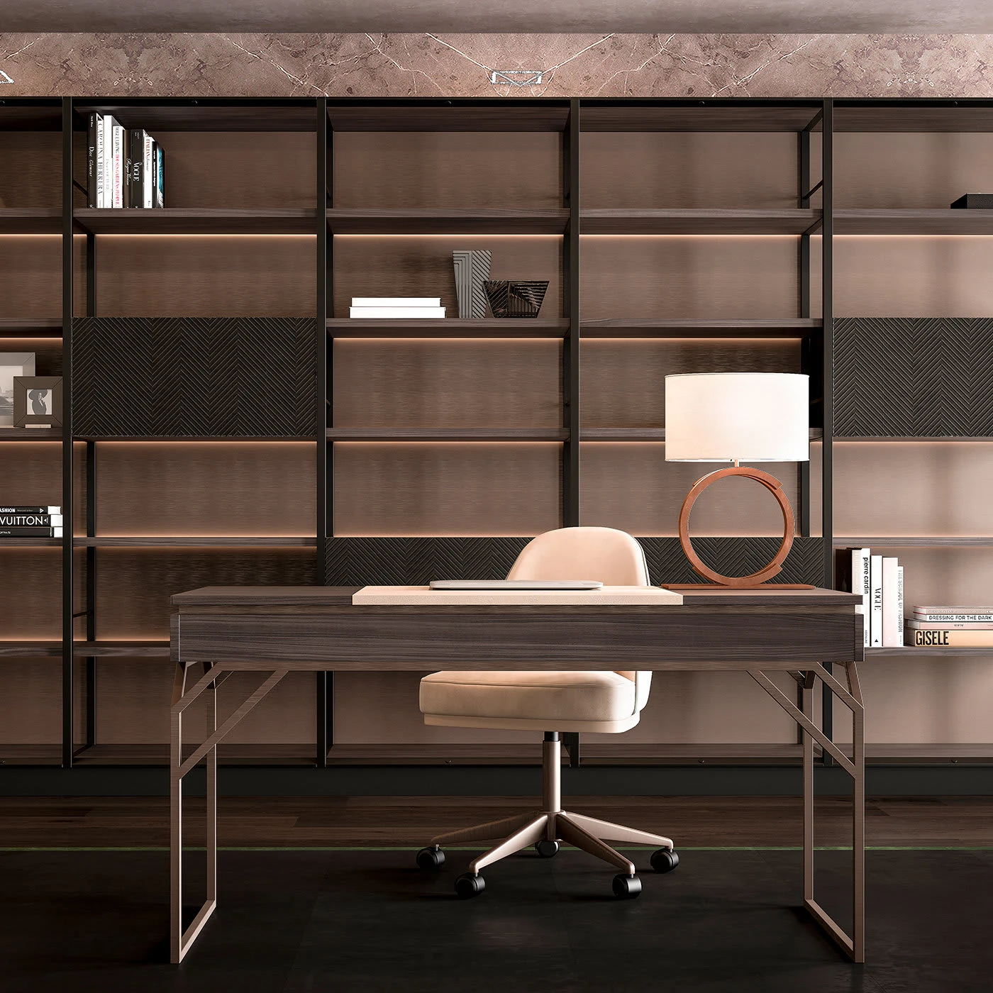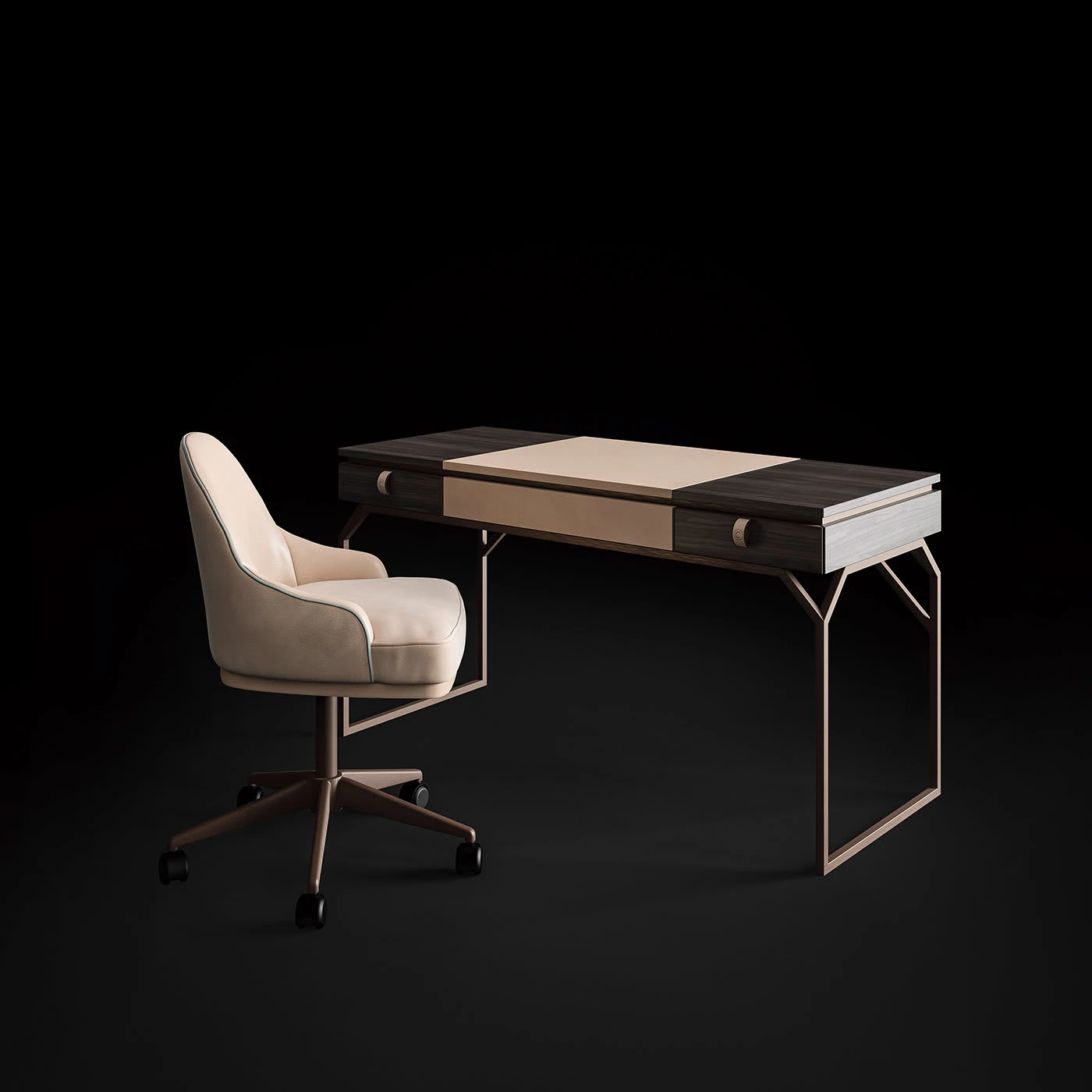 A highly functional and clean design characterize this desk featuring soft leather, an exotic style wood top and a sturdy metal base. Perfect for sitting down at to tend to your writing or organizational needs, whether in an office or personal space, the desk will compliment any contemporary decor.