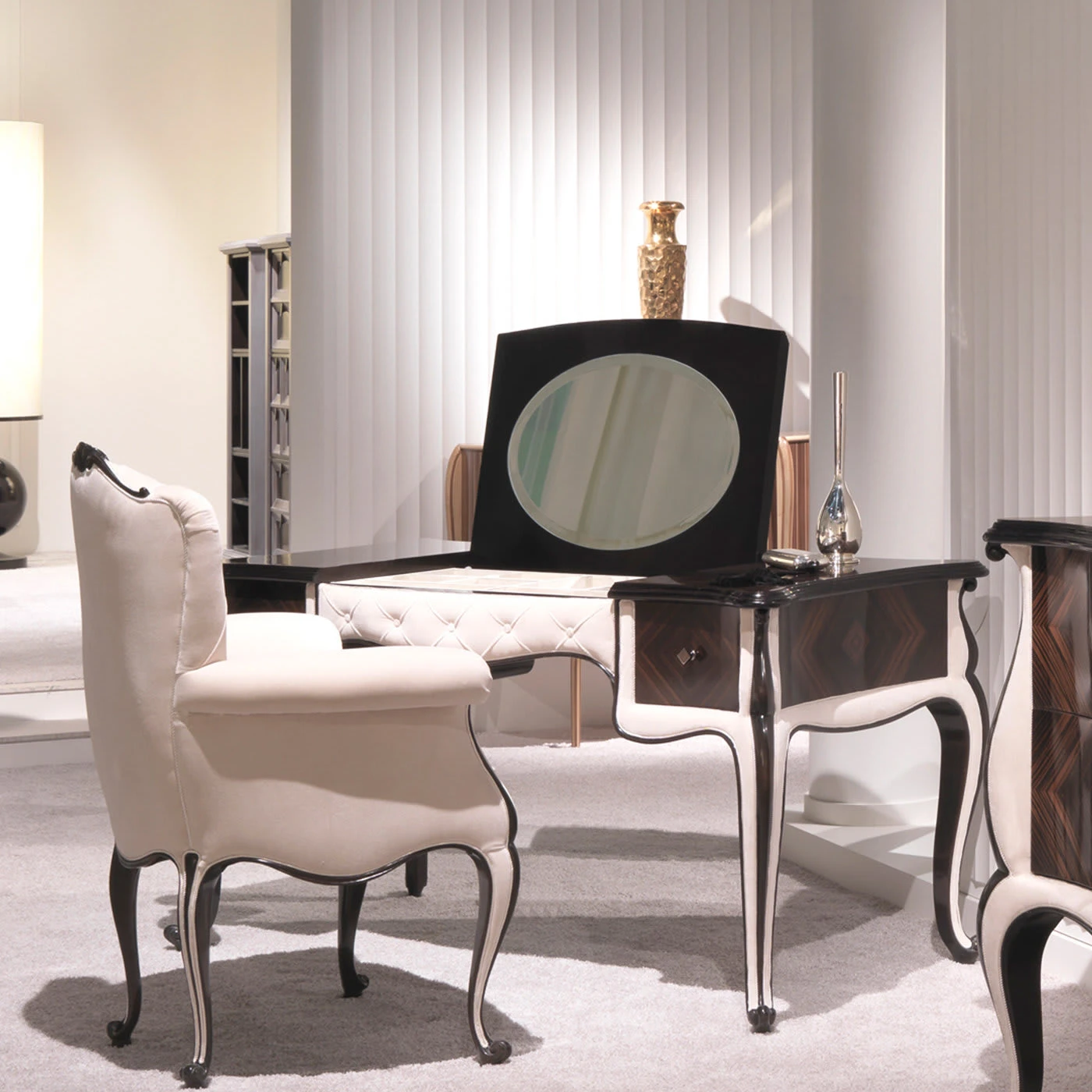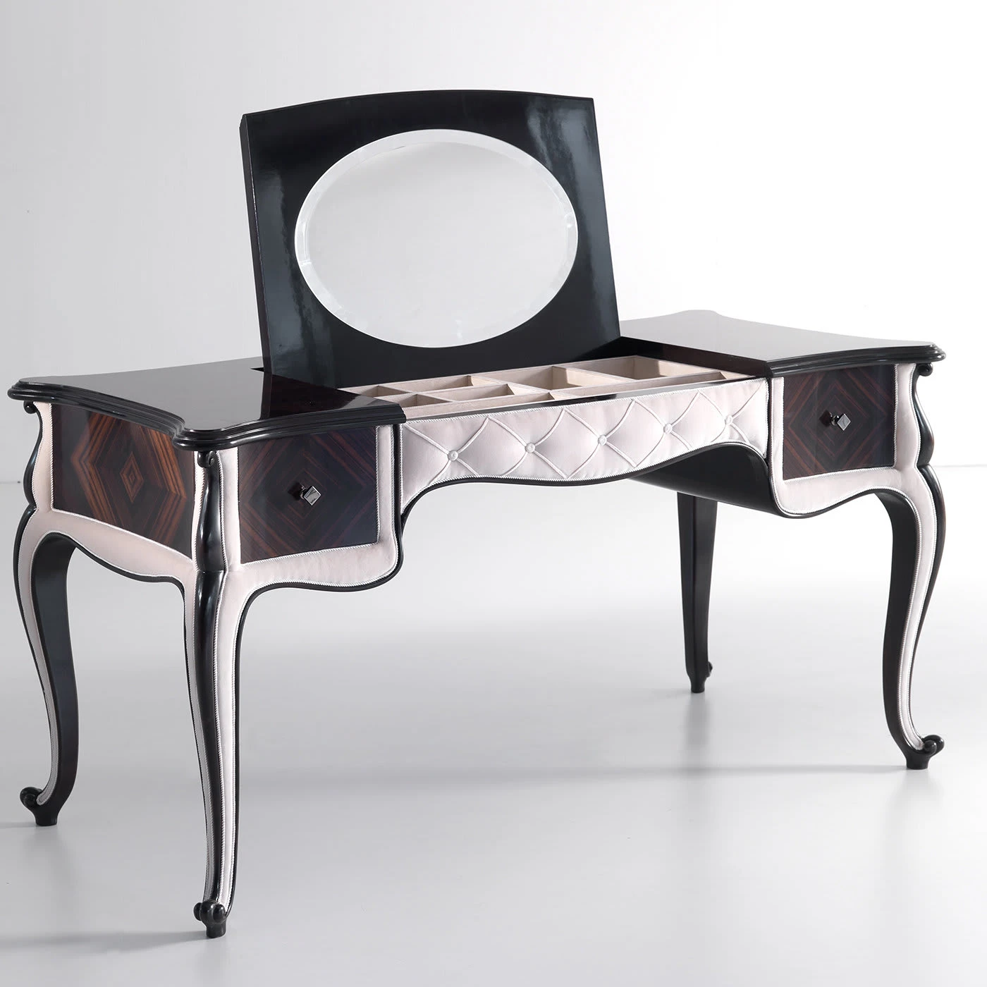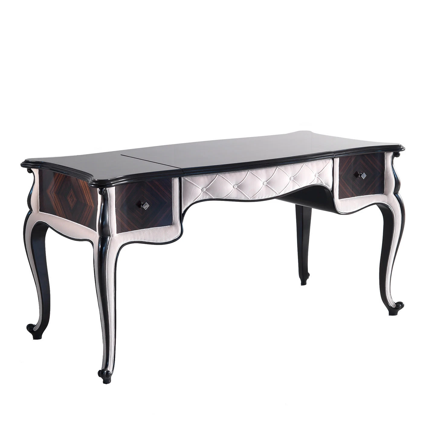 The distinctive and intense veining typical of Makassar ebony are showcased in this exquisite vanity table gracefully resting on four cabriole legs. Precious inserts of light leather extensively adorn the design, including the quilted motif in the front. Two spacious side drawers complete the vanity table. Table also available with alternative fabric details upon request, please contact the Concierge for details.