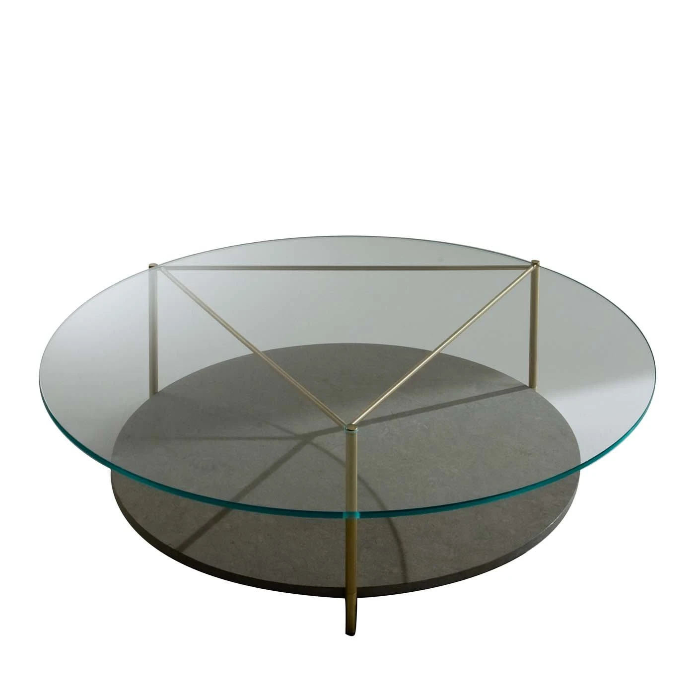 Echo tables allow the customer to create unique combinations with one of two shelves in different marble varieties depending on their individual taste and creativity. This dynamic and sophisticated Echo Coffee Table is crafted in satin brass with the lower shelf in matt polished ash gray marble and the table top in extraclear glass.