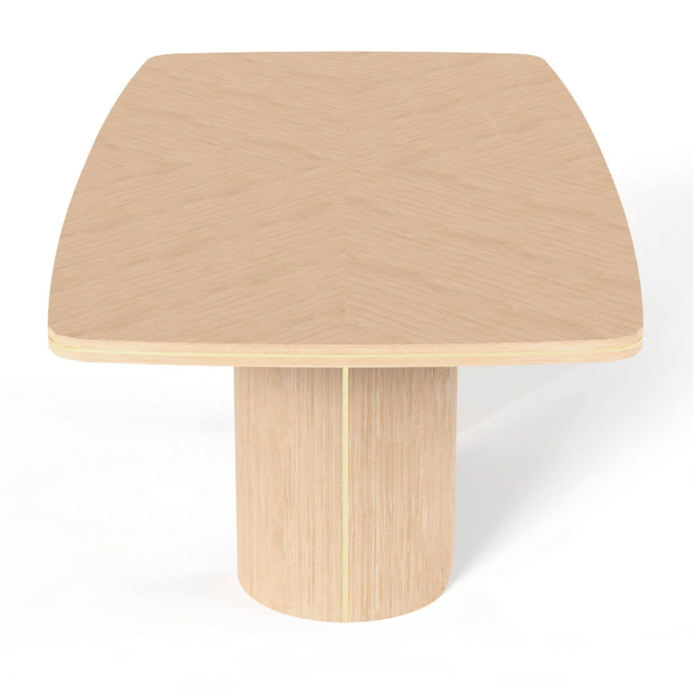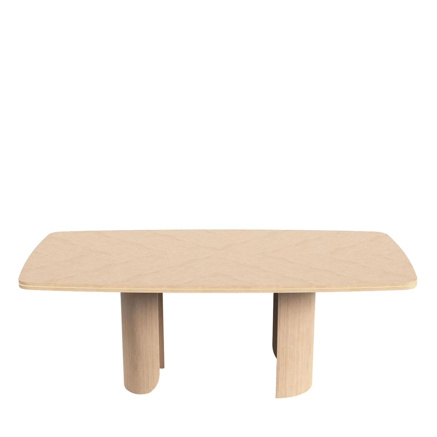 Striking in its extensive wheat-toned multilaminar veneer, this dining table is sure to become a natural gathering place. The predominance of shapely curved profiles underscores its convivial spirit, while the presence of a golden metal insert lends it a precious feel. Featuring a practical extension mechanism with two extra elements, it is finished with a water-based varnish for a natural effect.
