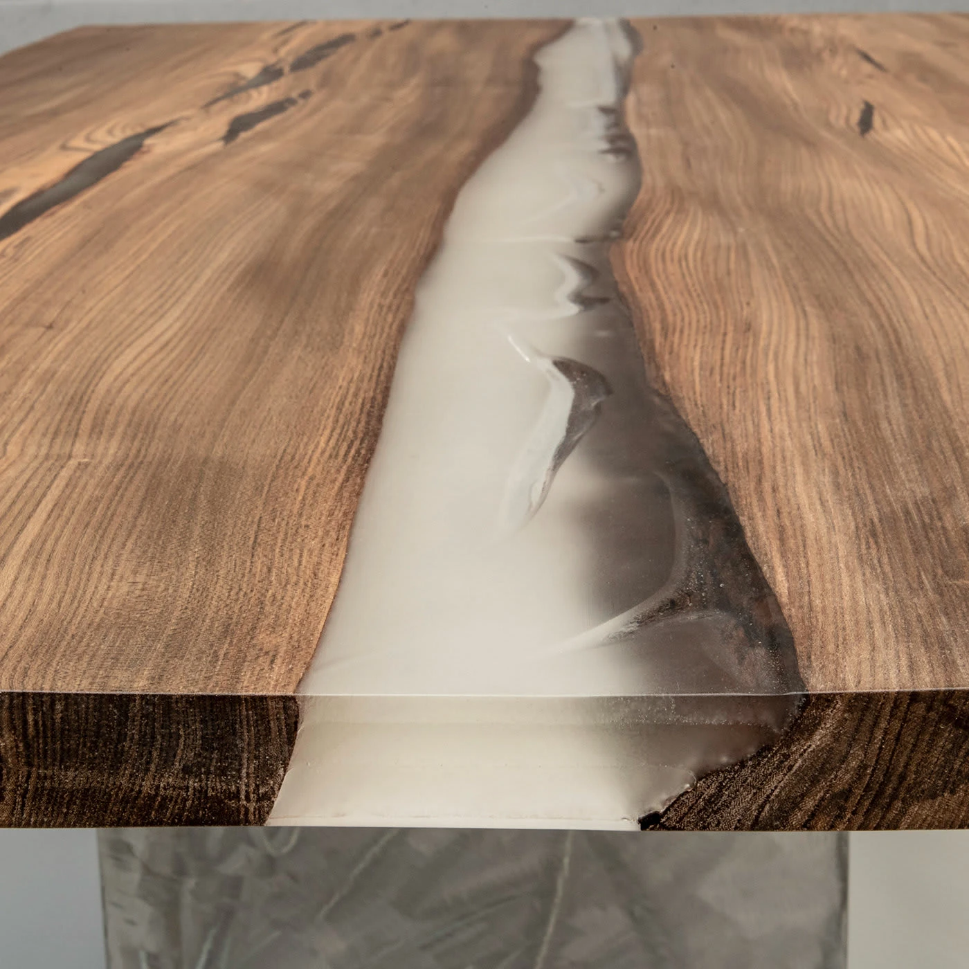 Like all Tabula creations, this spectacular table is a one-off, showcasing a top composed of two planks made of 600-year-old elm fossil wood from a trunk aged 60-70 years from the bed of the Sava River in the Balkans. The grey-green color with pearly shades results from the slow process of fossilization of the wood, blending with the original veins to create the unique and timeless surface. Showcased by an iron block pedestal with a clear finish, the natural signs of aging are maintained intact with resin inserts and the surface is highlighted by a wax oil coating.
