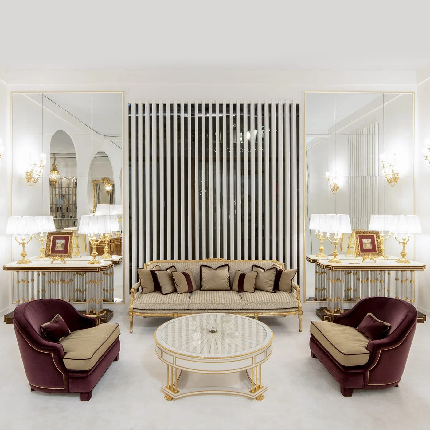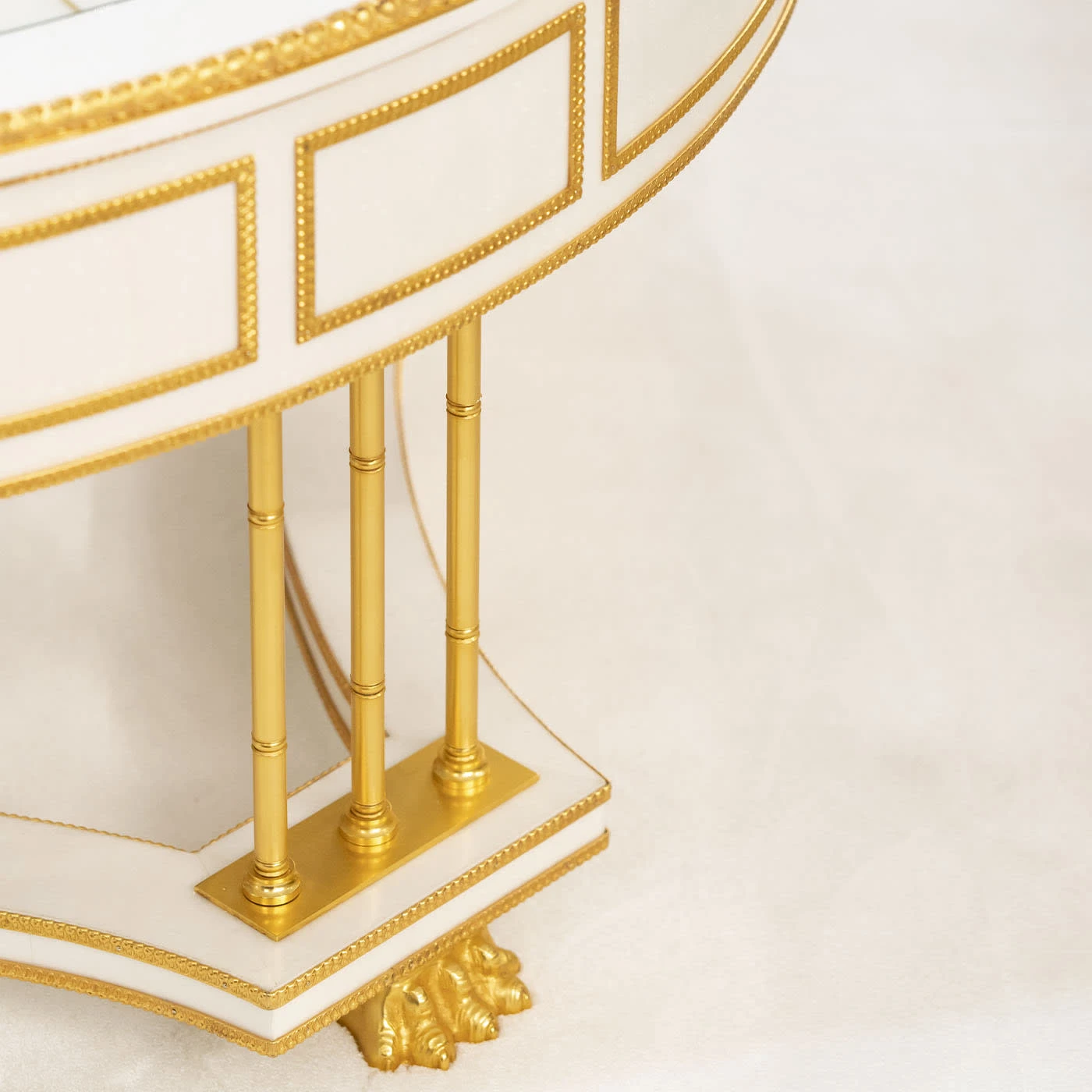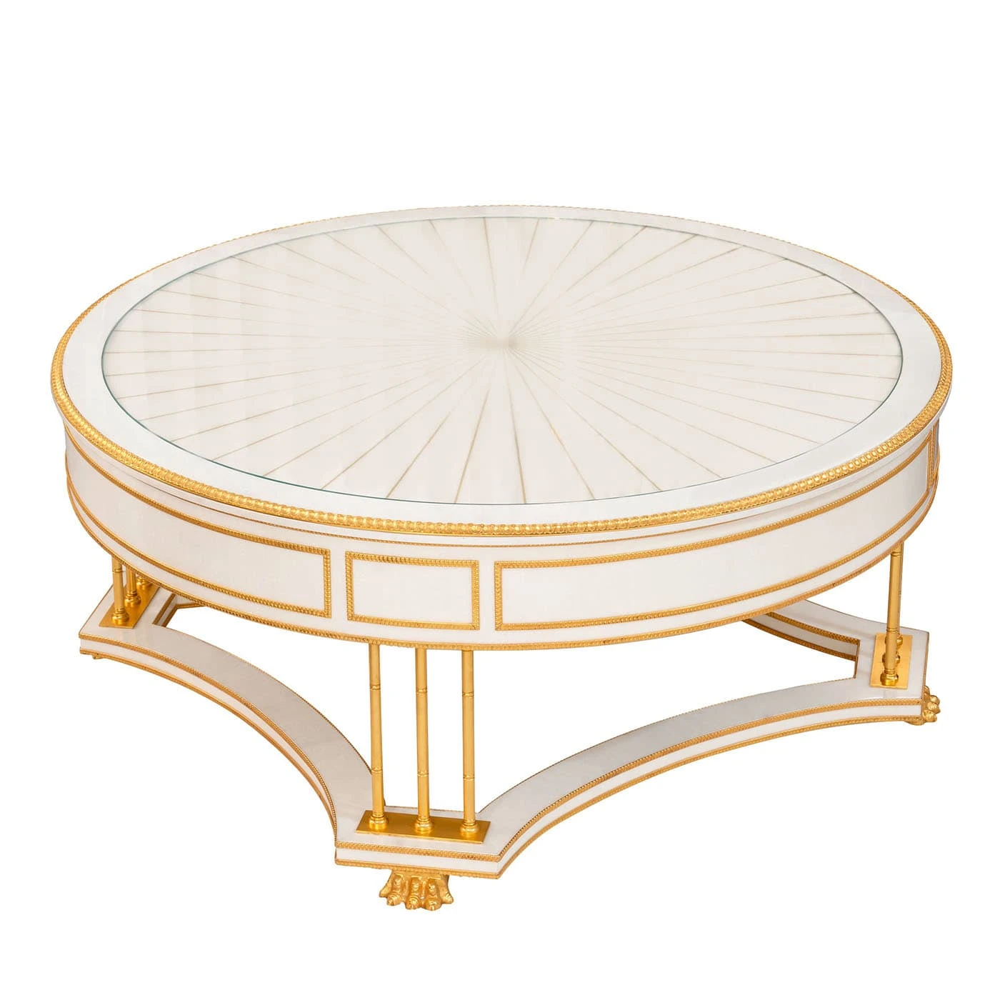 Plush materials and eccentric details – like the zoomorphic feet – make this round coffee table in sturdy erable a superb example of English style furniture. The bronze profiles, decorative frames, and cylindrical legs are plated in 24K gold for a statement of pure opulence. A clear glass disk seals the sunburst bronze pattern inlaid into the top.