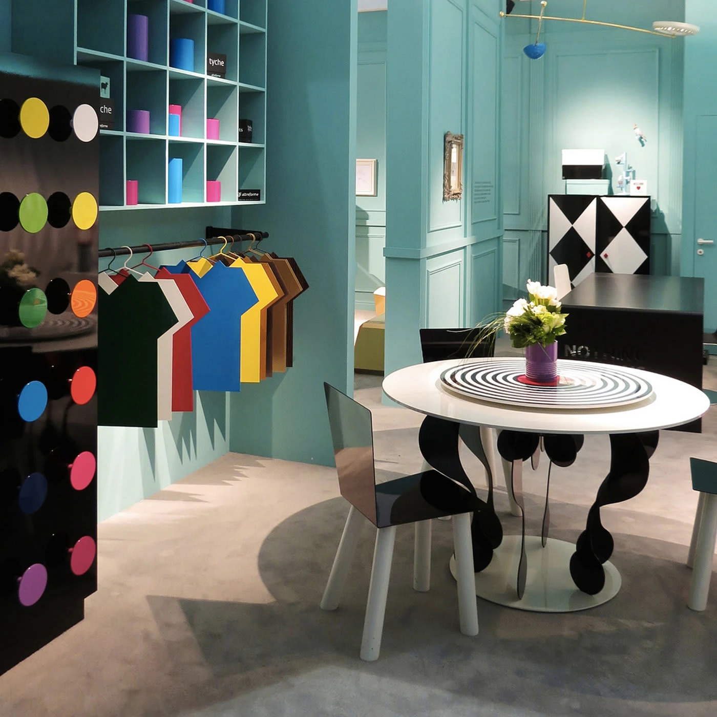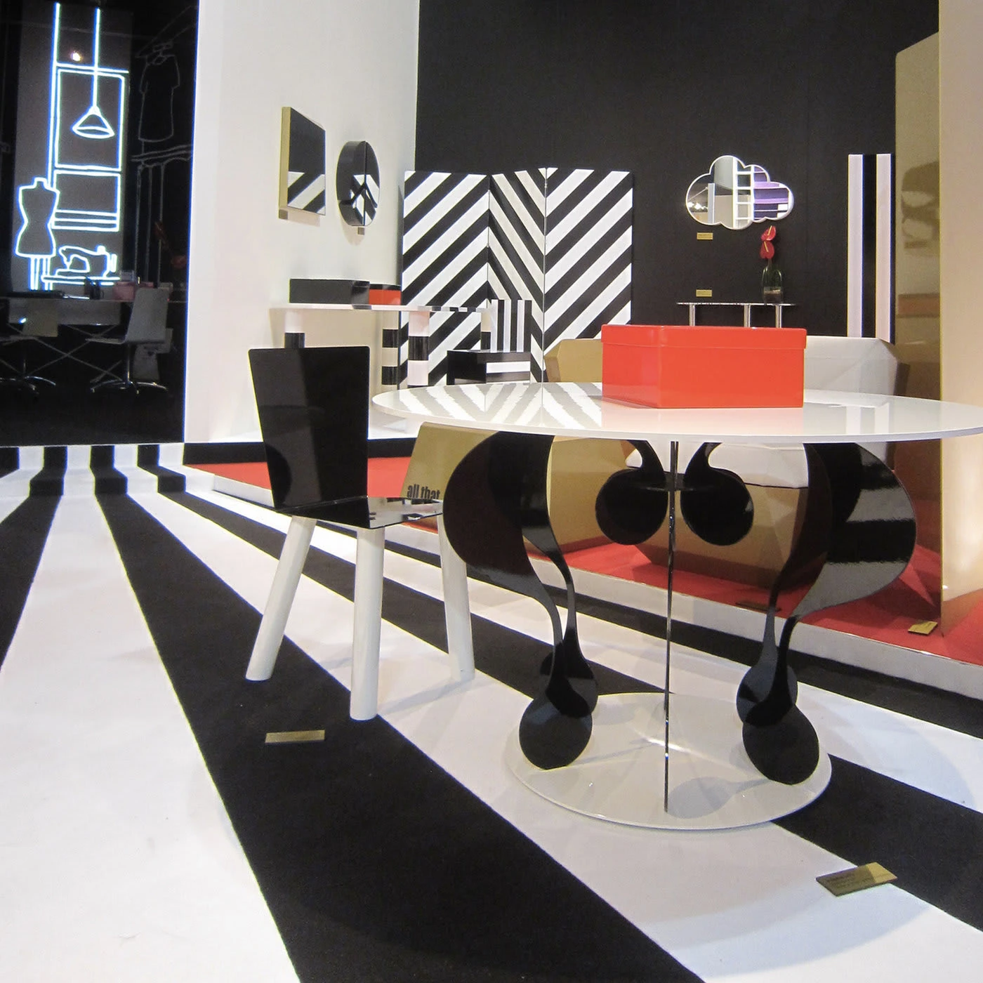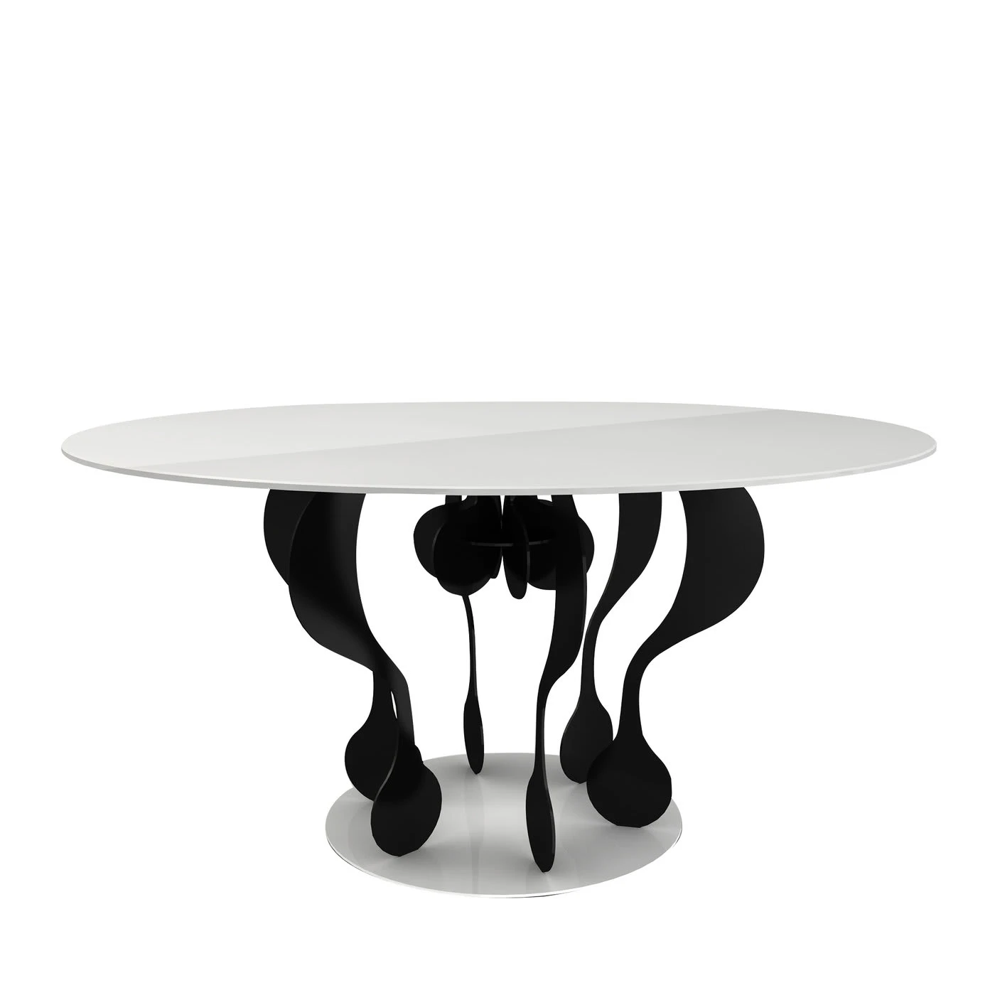 Graceful and eye-catching in its design, this contemporary table will elevate any dining room decor with distinguished elegance. Entirely crafted of aluminum in the classic black-and-white color combination, the white round top rests atop a gracefully curving black pedestal with a white base. The name of the table derives from its standout element, the six black-finished components at the base shaped like question marks that create a visually appealing flair to this design. Can be showcased with the black Lingotto chair for a glamorous effect.
