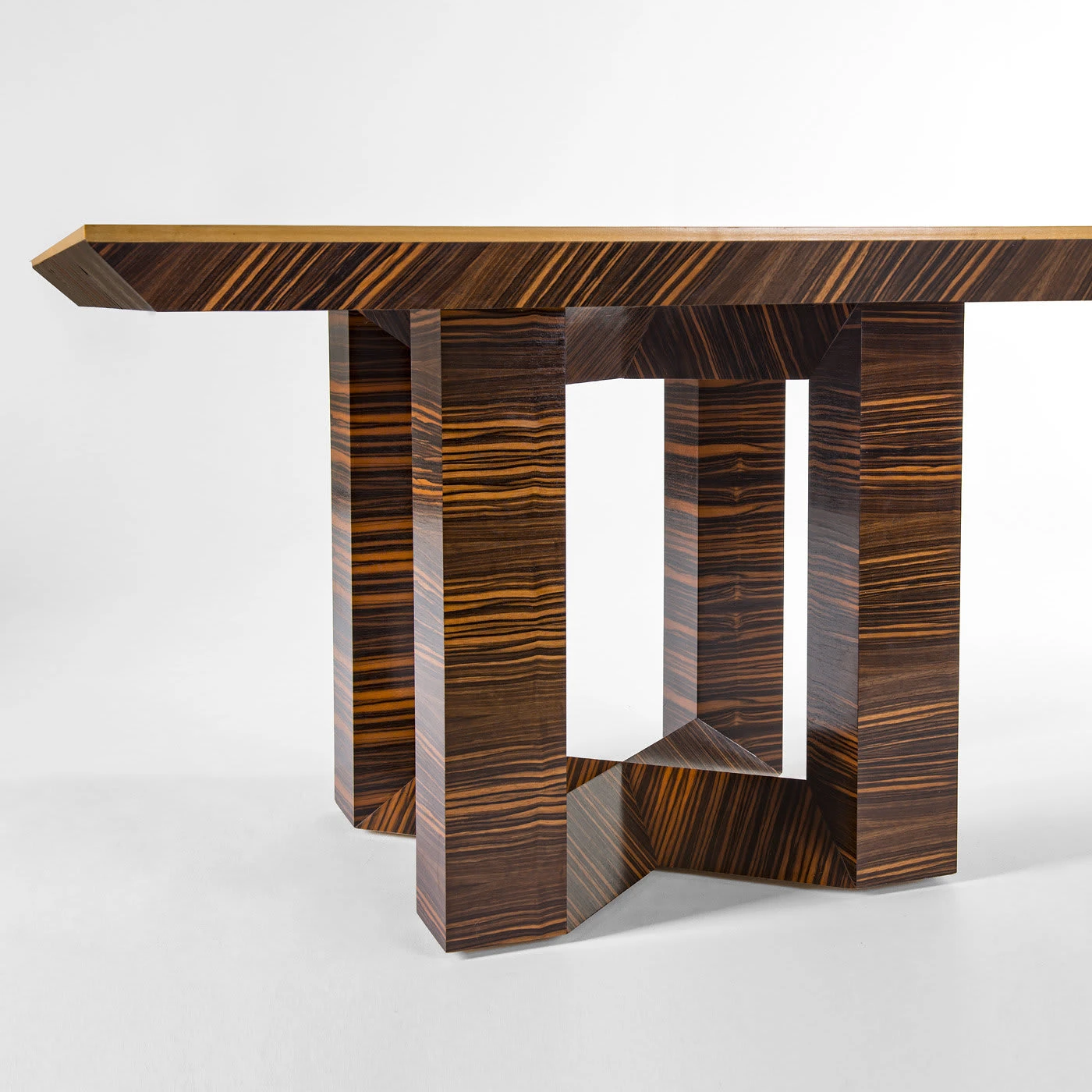 This square table features a unique look that will make a statement when placed in any home. The structure of the table top was crafted in ebony macassar wood, which has been worked using a interwoven technique creating alternating grain patterns. The perimeter edge of this piece is crafted in maple wood for a delicate accent. Any dining experience will be enhanced thanks to this expertly-crafted table. Designed by Antonio Berdondini, year 1930.