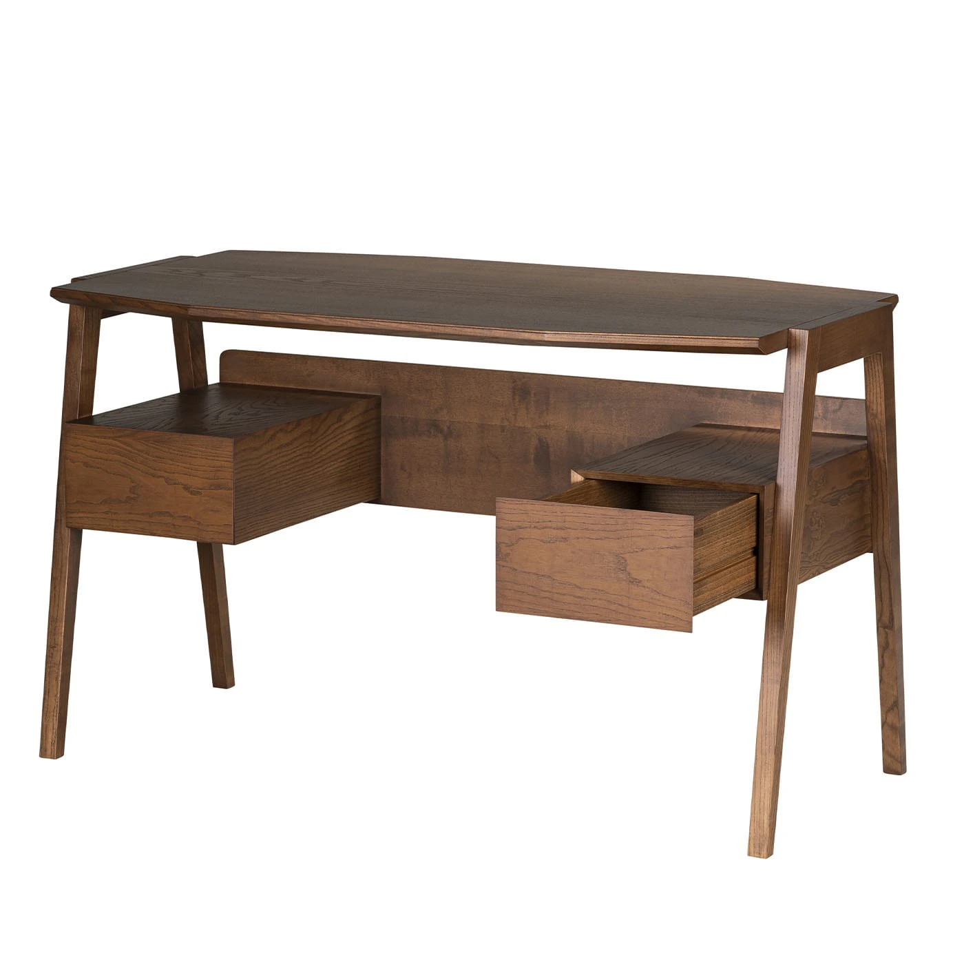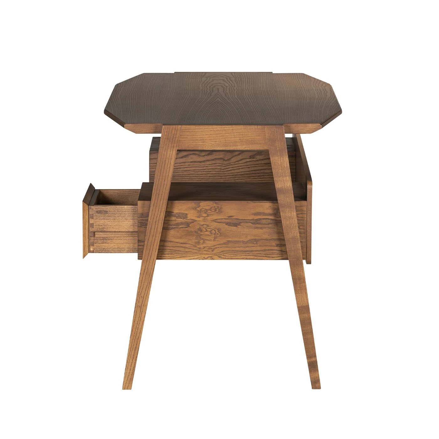 Designed by Centro Ricerche MAAM, this writing desk features a clean contemporary shape of timeless character. Handcrafted of ash wood, it features an octagonal top resting on four legs and is completed with two side drawers and two open compartments. Please consult the Concierge for further information.