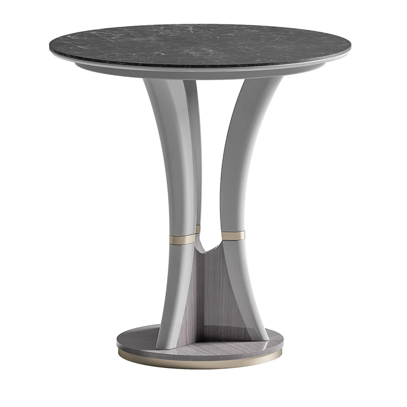 Side round table with lamina top, wood finish frame, lacquered tecnonabuk, and metallic finish inserts. Please get in touch with the Concierge for customization options.