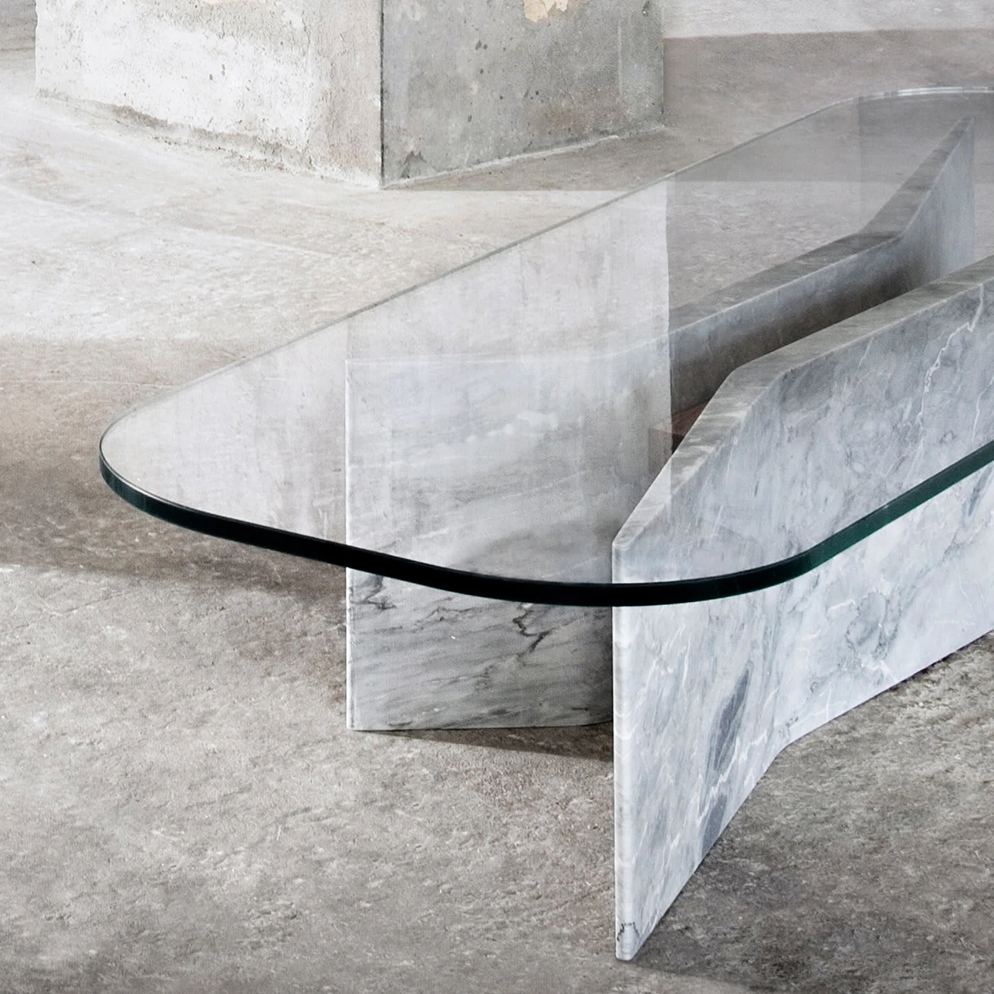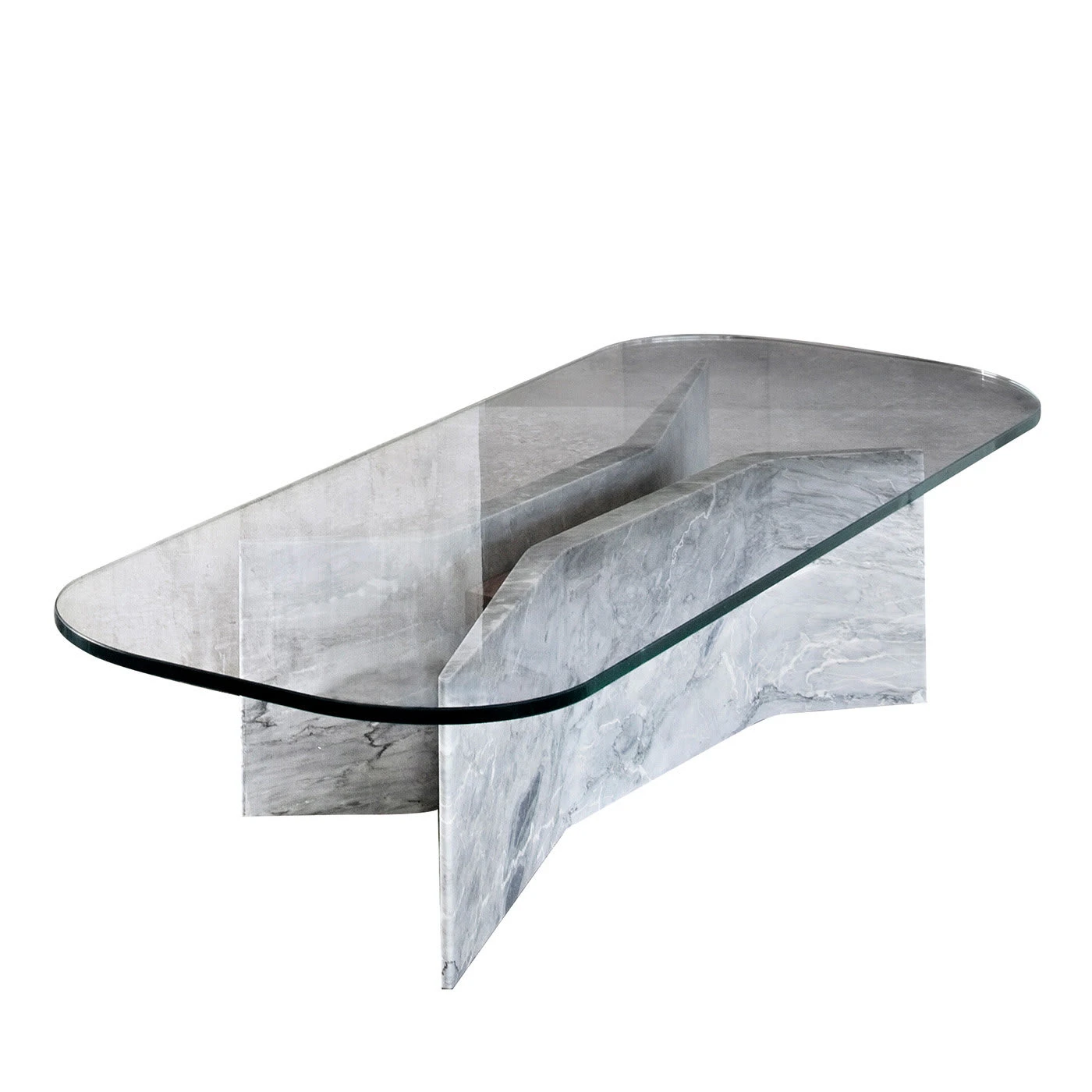 Topped by an extra-clear glass top (1.5cm thick) with rounded corners, this sophisticated coffee table features a sturdy base combining two sculpted slabs in prized Versilys marble distinguished by an effortless sculptural effect. This exclusive design will elegantly complement contemporary decors with its sleek aesthetic and captivating veining.