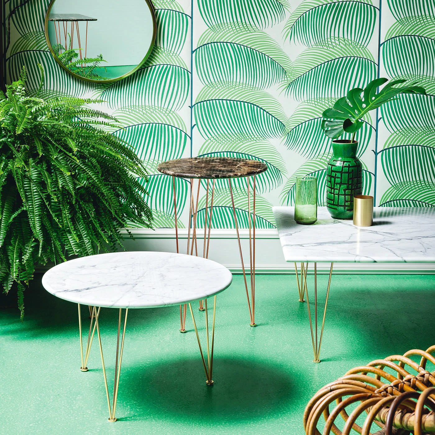 Simple yet elegant, this round table features a low profile that showcases the superb Emperador marble top with its honeyed veining standing out against the dark brown background. The mid-century silhouette features three hairpin metal legs finished in carbon black for a bold and modern effect. This versatile piece will complement a living room decor with its distinctive design that can be arranged in a composition with the other tables of the same Flamingo Collection boasting square and triangular tops to form an alluring high-low display. Available also with a Carrara marble top.