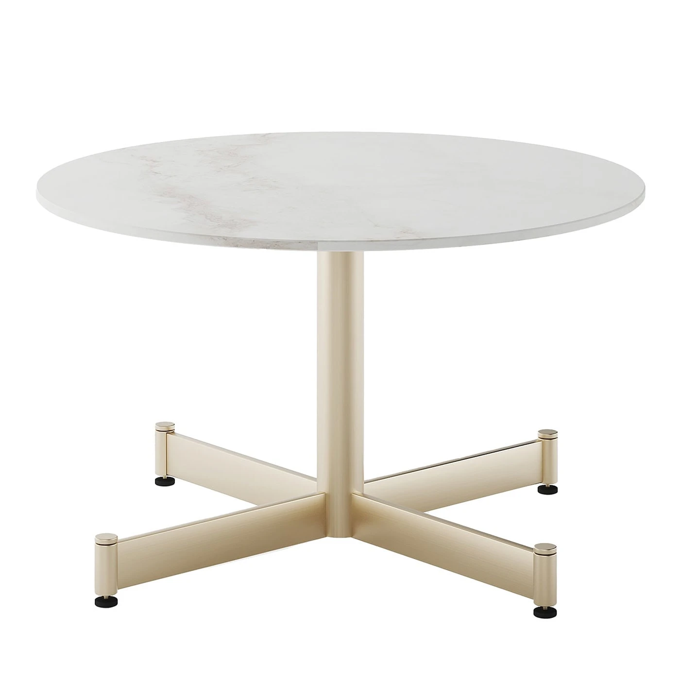 This elegant café table from the Fly Collection will lend sophistication to an aperitif or tea break shared with a friend by the pool or in a refined hotel bar. A luminous white finish was chosen for the round aluminum top, while the central column and four spokes radiating from it share the same luxe champagne finish. Inquire with the Concierge for available variants.