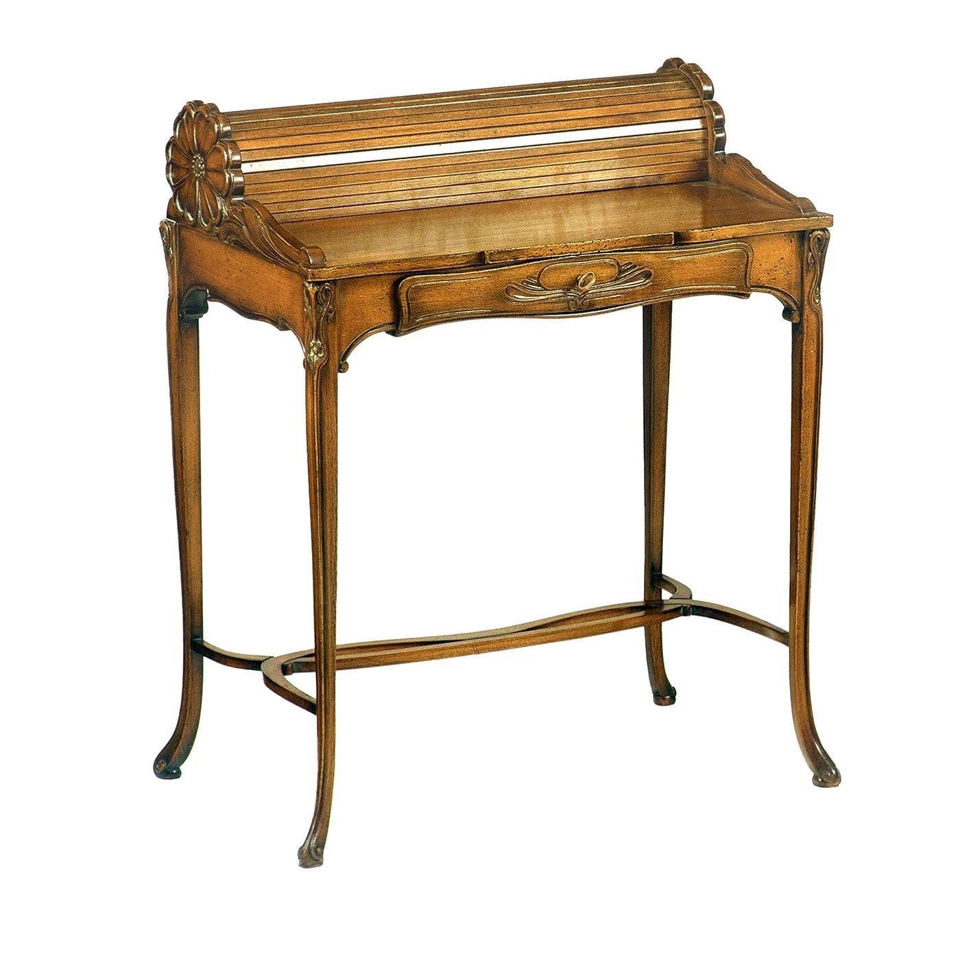 This bespoke writing desk exemplifies the fancy hand-carved aesthetic of Art Nouveau pieces. An impeccable reproduction of an original design from around 1880-1915, it is distinguished by a graceful beechwood silhouette equipped with a drawer that, when pulled, also reveals compartments in the roll storage unit with romantic flower-shaped sides.