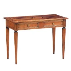 A perfect reproduction of an original design from the French Consulat period (1799-1804), this writing desk is sure to make a sophisticated statement in any classic-inspired study or bedroom decor. The distinguishing trait of its graceful cherry silhouette is the gorgeous inlaid motif adorning the top. Equipped with two drawers, it flaunts an elegant shellac polish.