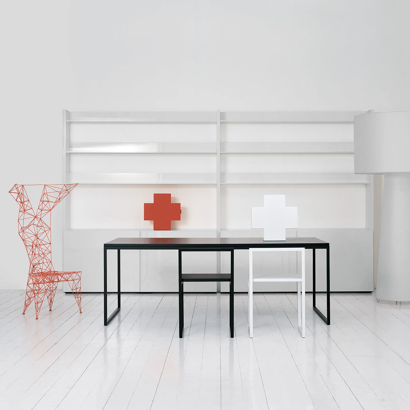 An ode to clean lines, the Fronzoni ’64 table embellishes settings with its absolute rigour and essential elegance. Designed by AG Fronzoni, this rectangular table has a base made of square tubular metal and a wood top in matte lacquered black. Austere and perfectly functional, the Fronzoni ’64 tables are the perfect expression of the designer’s vision, whereby geometry dominates function.