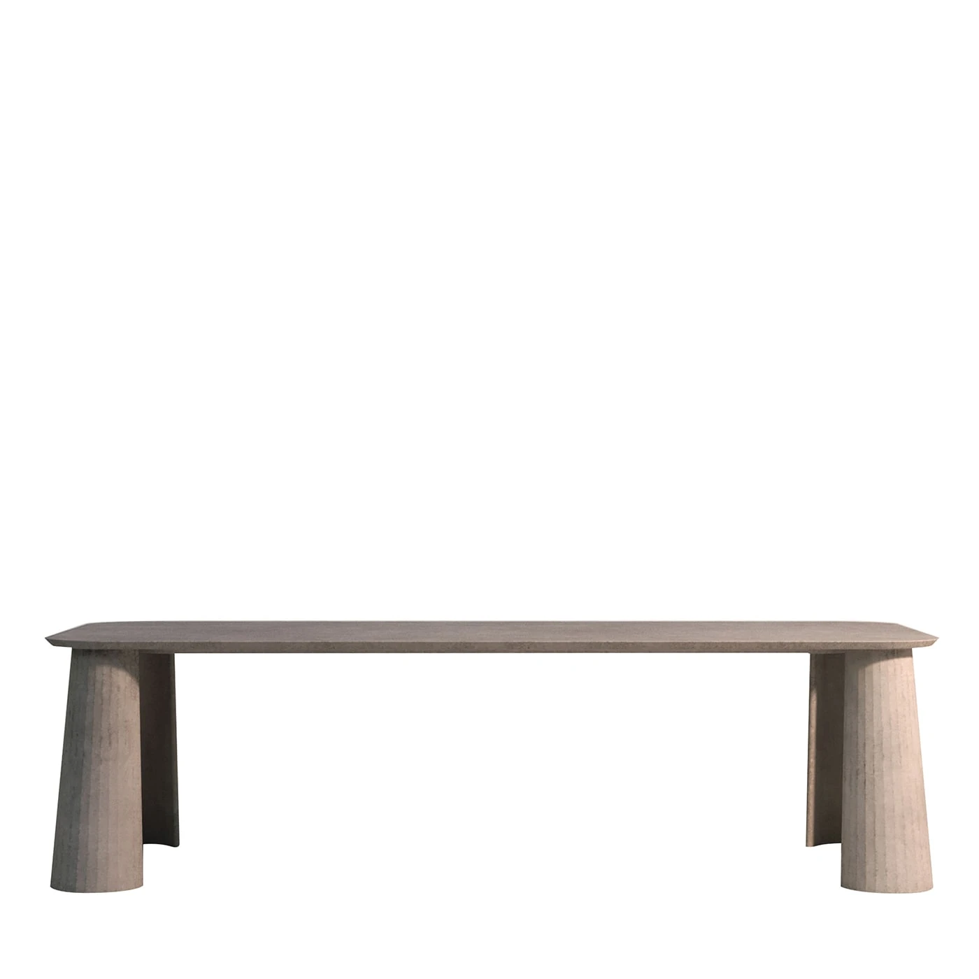 A sublime combination of classic and contemporary styles, this stunning dining table is capable of bringing a room to life on its own. Marked by a unique powder, it is entirely made of sandblasted and hand-treated ultra-high-performance concrete, lending it a high-edge and sturdy quality. Inspired by classical architecture, the long and rectangular top rests on four column-shaped concave legs marked by a grooved texture. Available in eight different shades upon request to the Concierge.